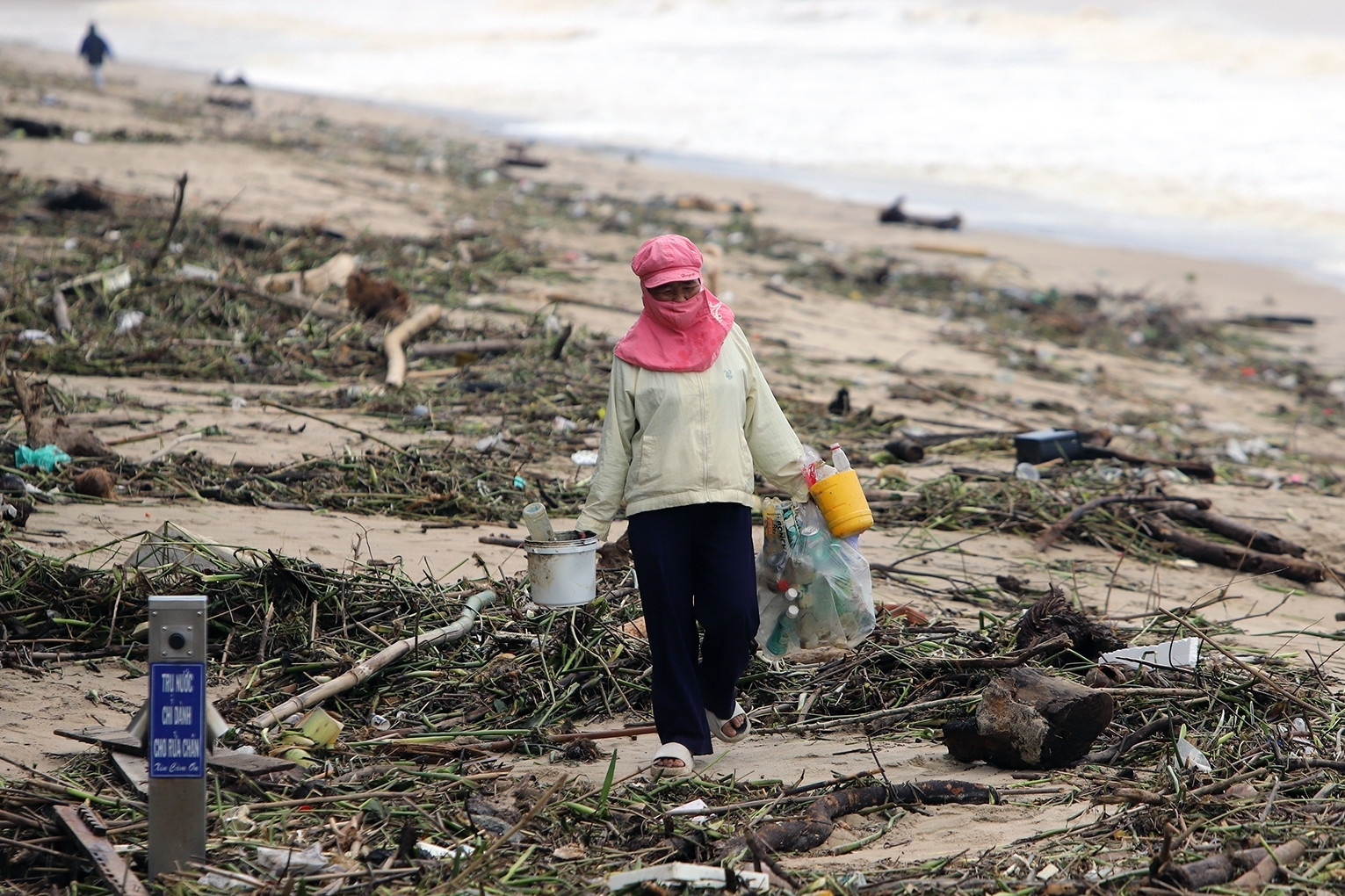 Nhiều cành cây, đồ nhựa, gỗ… từ nhiều nơi bị sóng đánh dạt vào, tràn ngập bãi biển TP Nha Trang (tỉnh Khánh Hòa). Khu vực bị rác dạt vào kéo dài nhiều km.