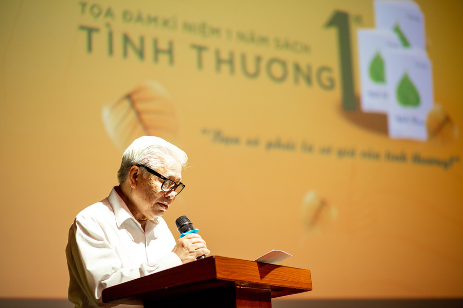 | Nhà thơ Vũ Quần Phương rất xúc động khi đọc cuốn Tình thương. |