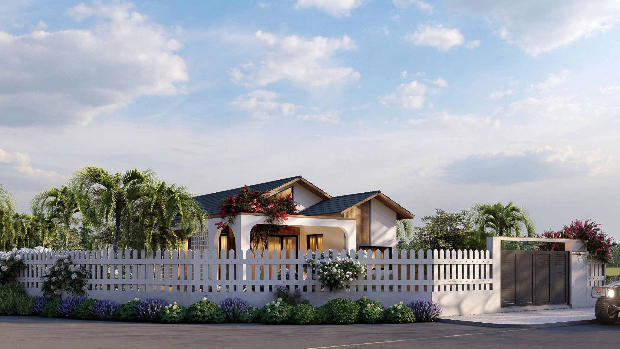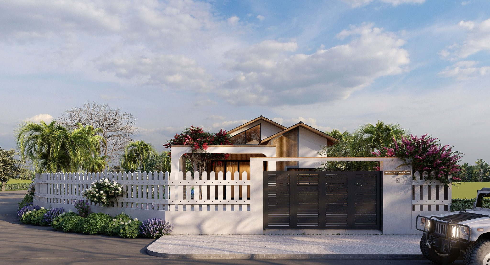Ngôi nhà mang kiến trúc truyền thống với mái dốc thoát nước mưa, mảnh sân vườn trồng rau xanh, hoa trái và sân cỏ êm ái.