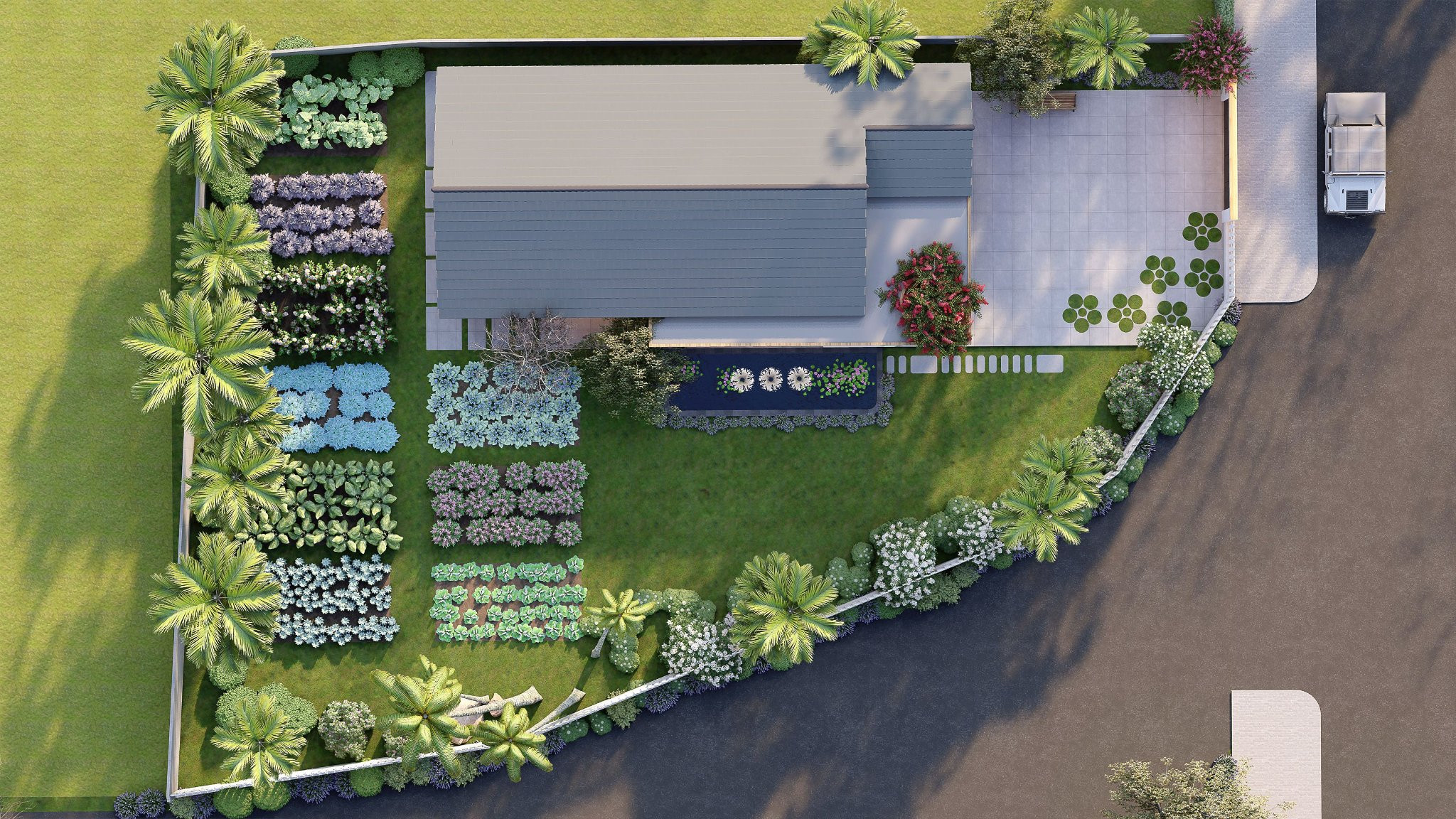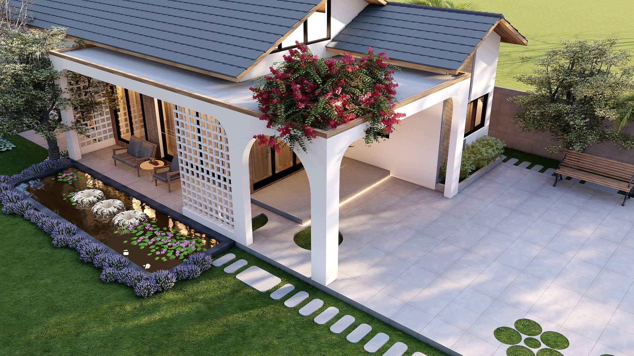 Mảnh đất nở hậu, khá đẹp lại ở lô góc nên kiến trúc sư có thể cho óc sáng tạo thăng hoa. Phong thủy là yếu tố được quan tâm hàng đầu trong thiết kế nhà này. Từ thiết kế cảnh quan sân vườn cho đến hồ bơi, tạo nên không gian hài hòa và có xu hướng khá tốt cho dòng khí vượng lưu thông.