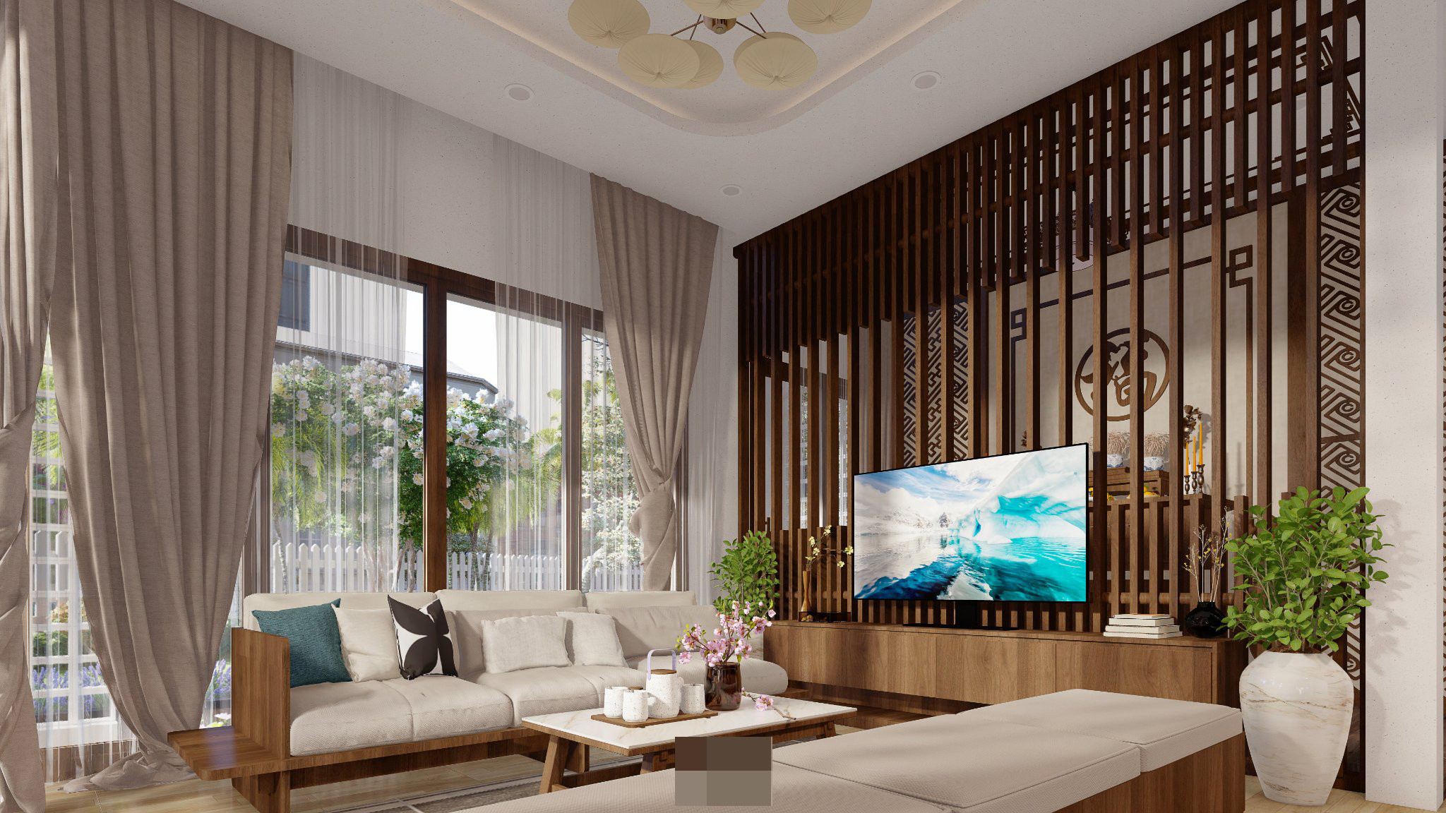 Phòng thờ nằm sau kệ tivi, ngăn cách bằng bức vách lam gỗ nghệ thuật, tinh xảo.