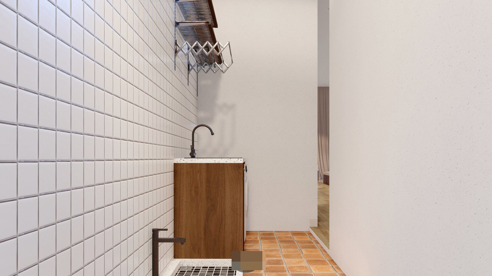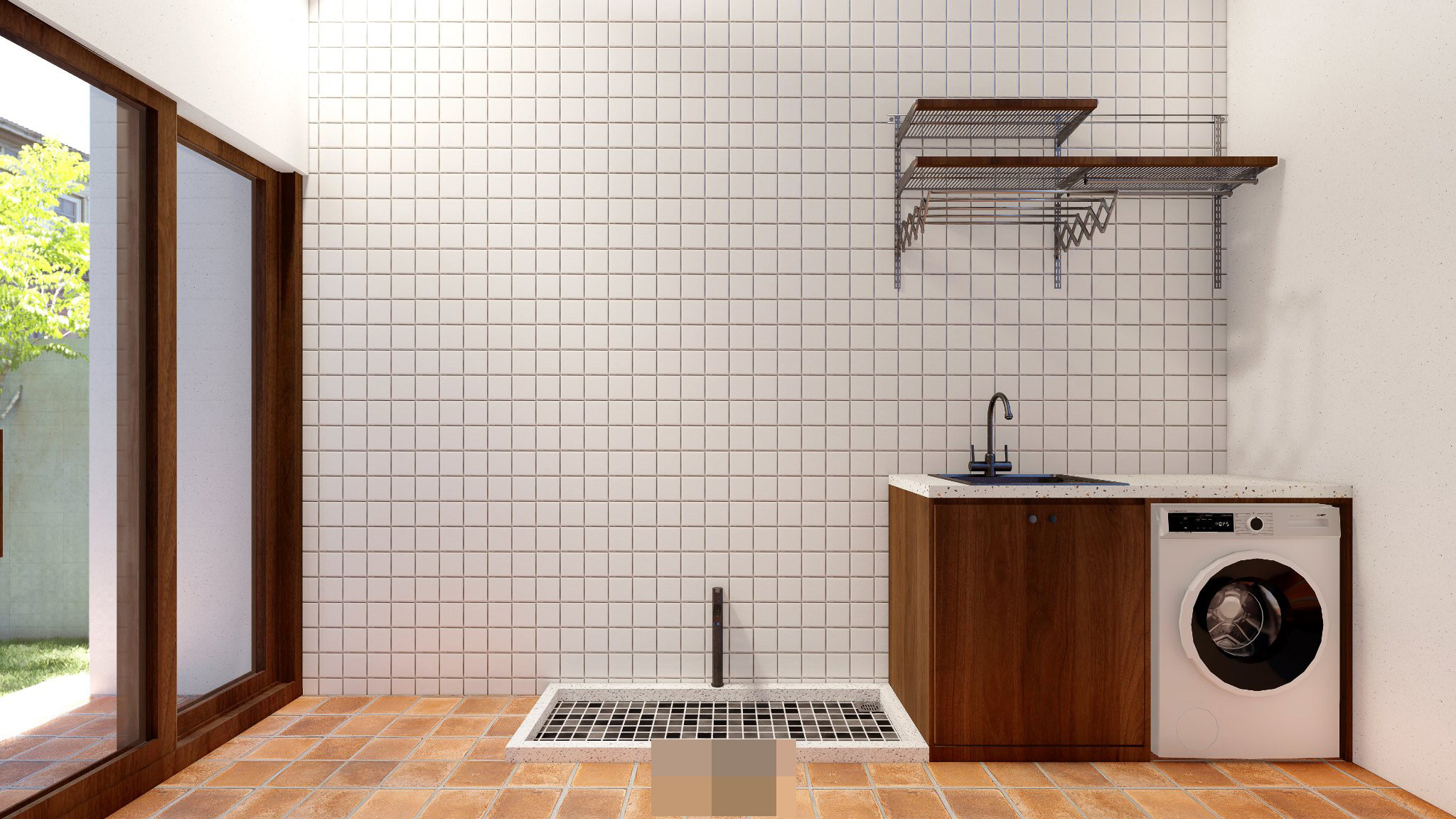 Phòng giặt đồ ngay lối dẫn ra vườn, thuận tiện cho việc phơi đồ. Tường ốp gạch thẻ màu trắng rất dễ vệ sinh.