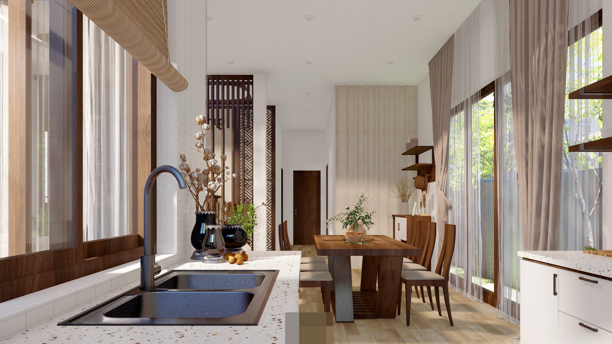 Phòng ăn và bếp tạo thành chuỗi liên kết mở, từ bàn ăn có thể xem tivi ở phòng khách và quan sát các hoạt động ngoài cổng.