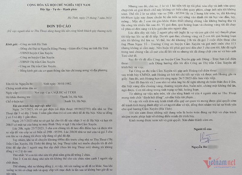 “Ngay lúc đó, chủ xe, 2 lơ và 1 lái tiến tới ép tôi phải xóa clip và ảnh vừa quay, chụp (tôi có giải thích chỗ này không có biển cấm quay phim, chụp ảnh nên tôi không xóa). Thế rồi 2 lơ xe nhảy vào xe 29B-053.94 lấy ra 2 hung khí tròn, to, dài khoảng 60-80cm (loại gậy này được chuẩn bị sẵn trên xe) xông vào đánh tôi túi bụi vào đầu, tay và mông... Mặc dù 2 con tôi gào khóc thảm thiết nhưng chúng vẫn không buông tha và tấn công tôi nhiều lần sau đó. Vì quá đau, quá hoảng loạn và choáng váng tôi đã chạy về phía có đèn sáng và cầu cứu người dân”, đơn viết.