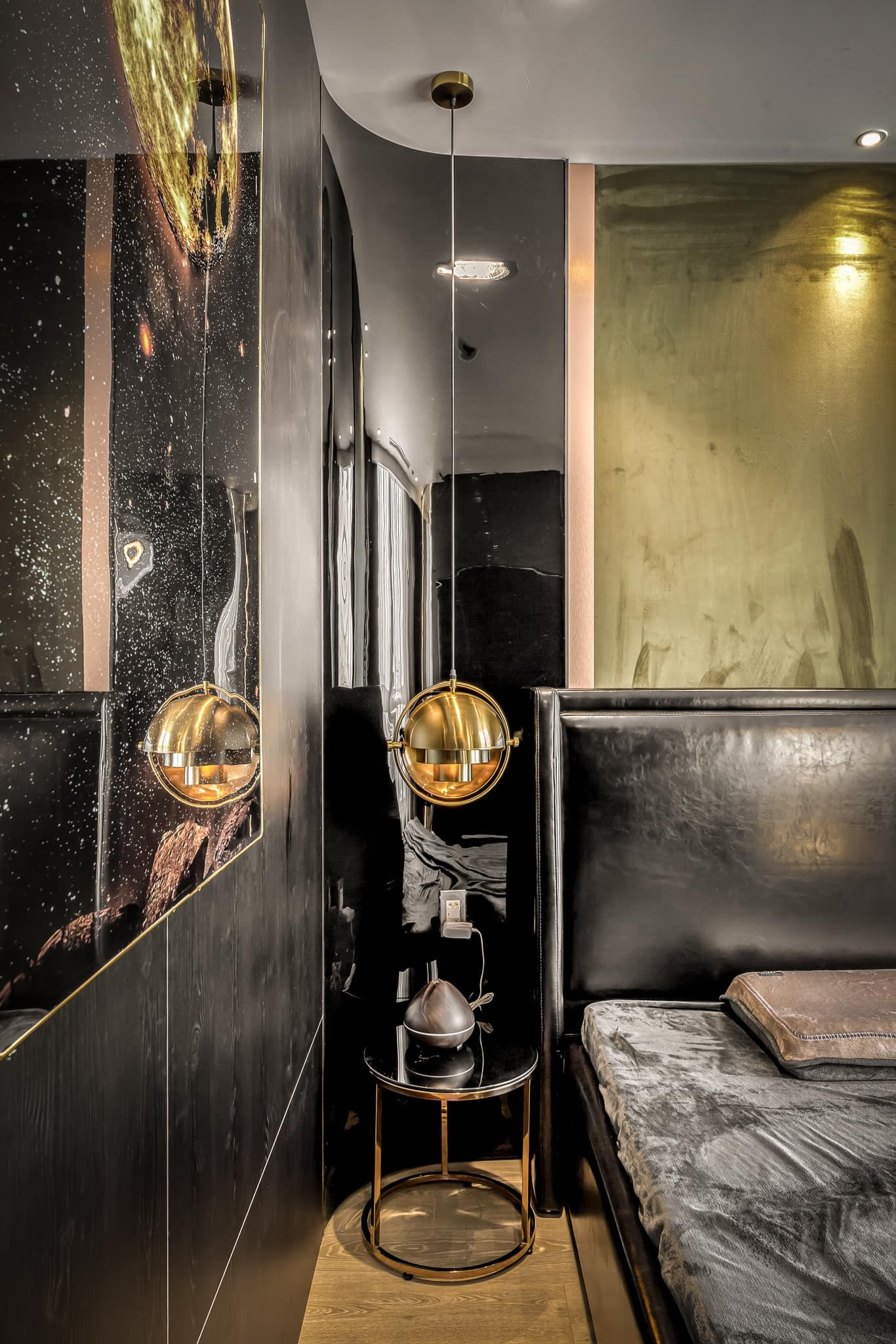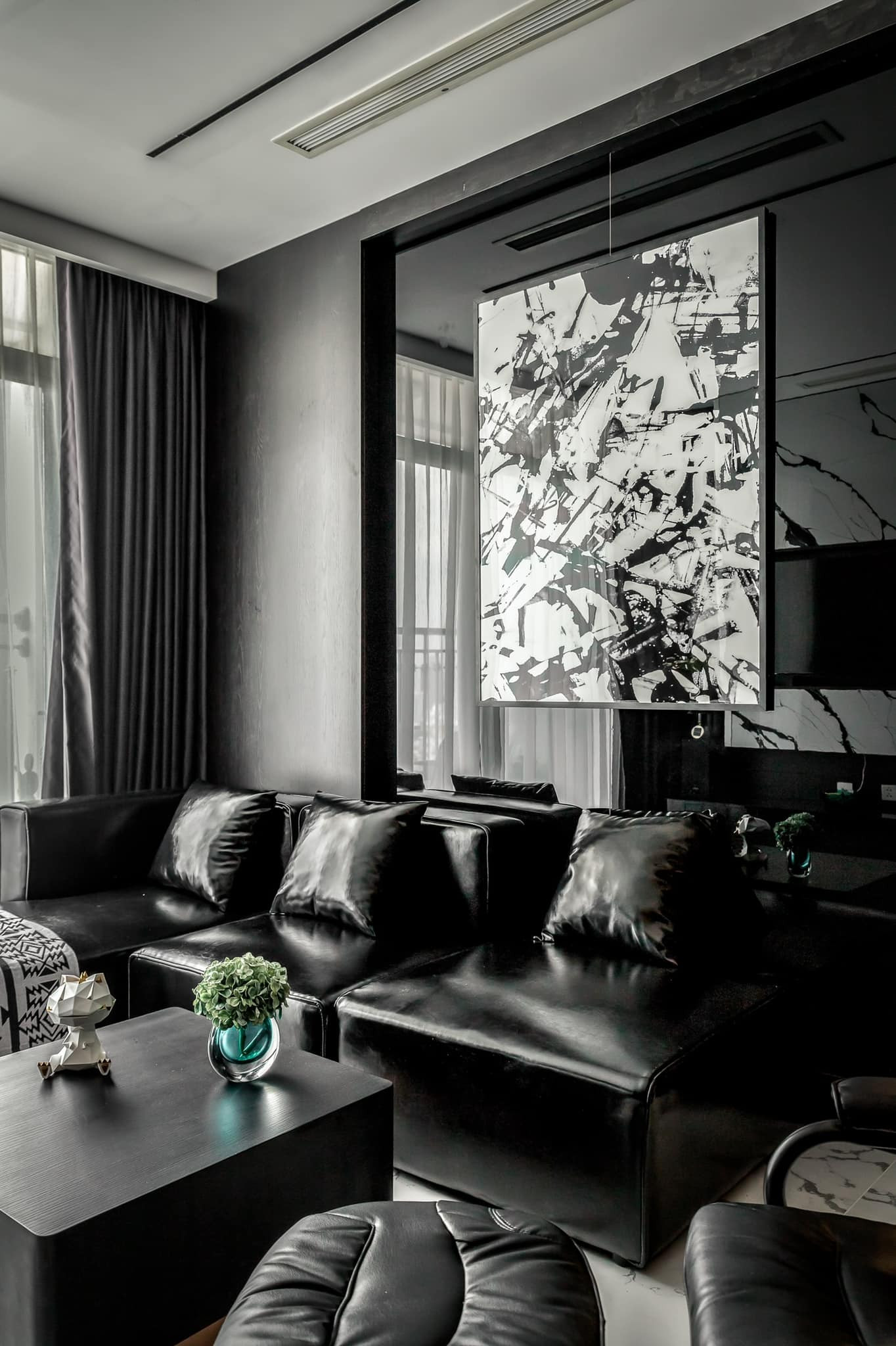 Phòng khách rộng với tông màu đen bắt mắt, đèn vàng giúp không gian bớt cảm giác lạnh.