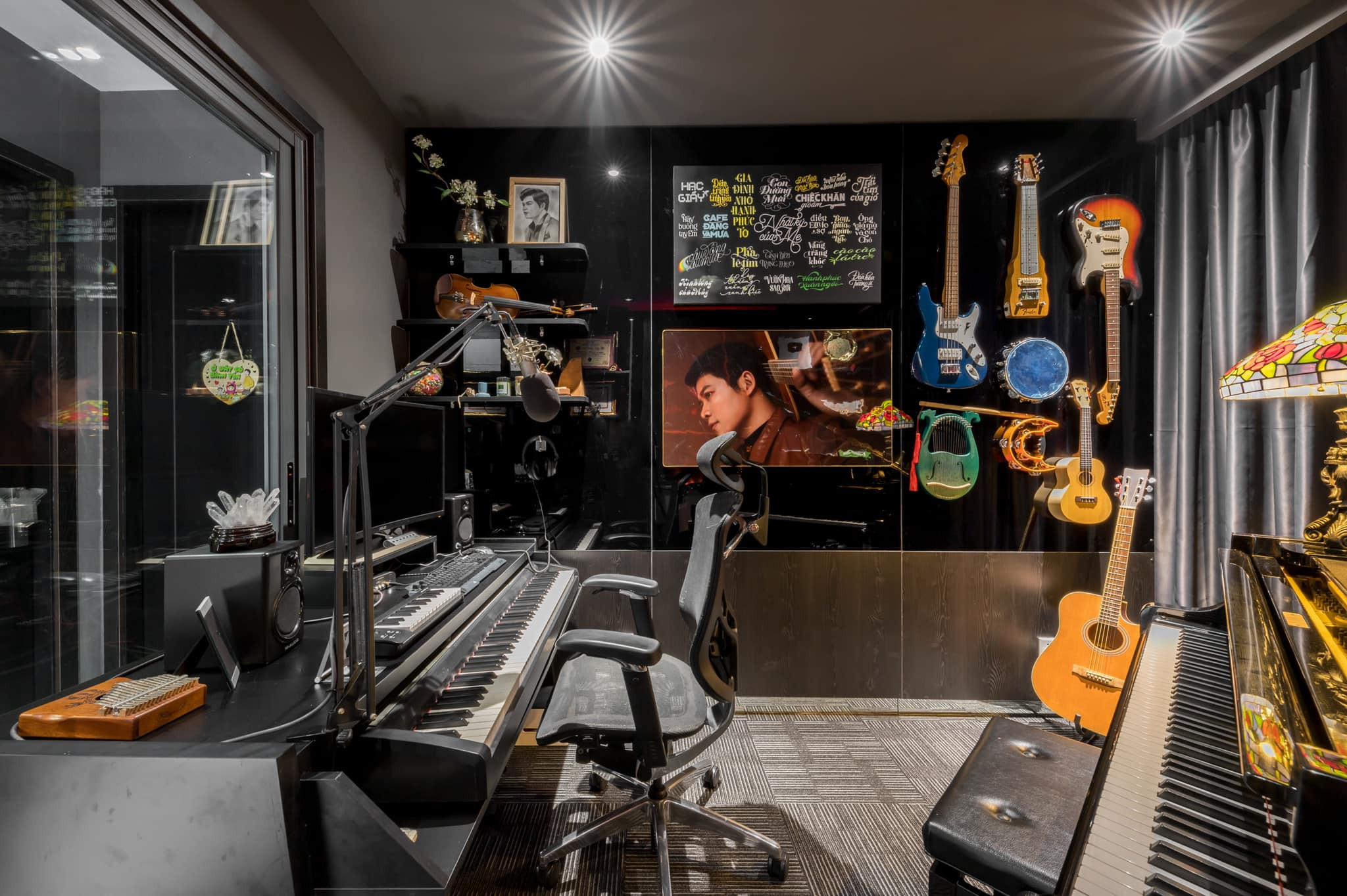Phòng làm việc trưng bày nhiều nhạc cụ, điểm nhấn là cây grand piano Yamaha đắt đỏ.