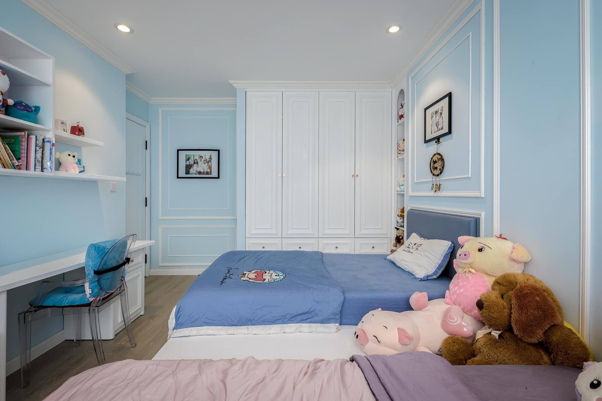 Phòng ngủ của con gái nhạc sĩ theo tông màu xanh-hồng pastel cân xứng nhẹ nhàng.