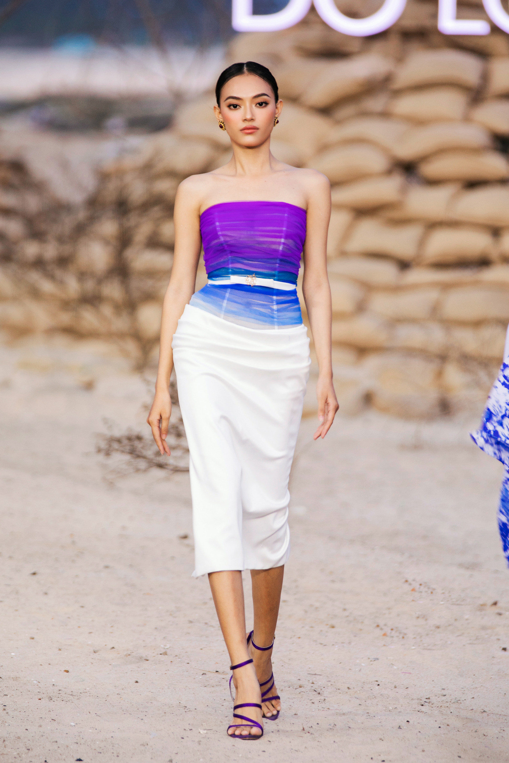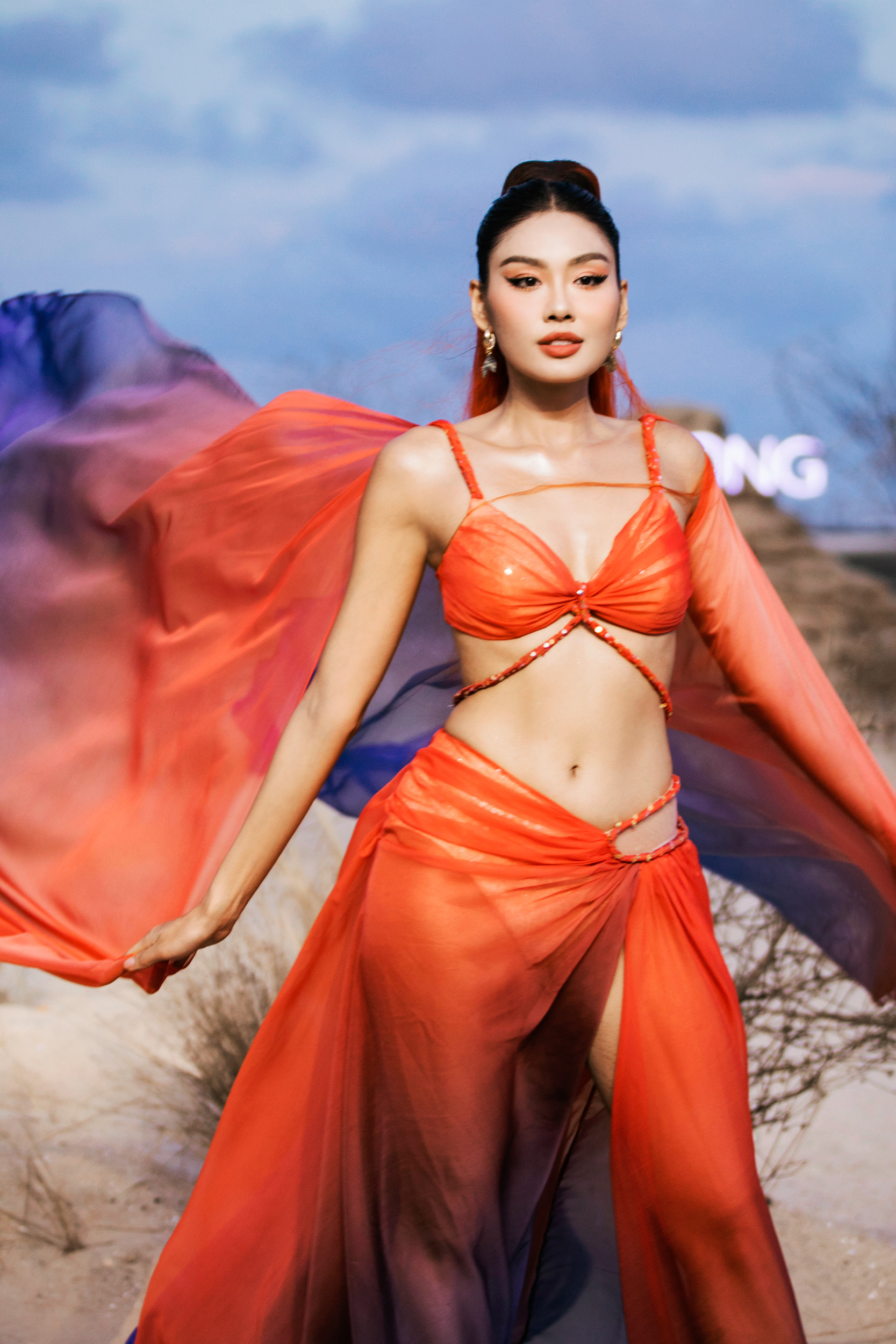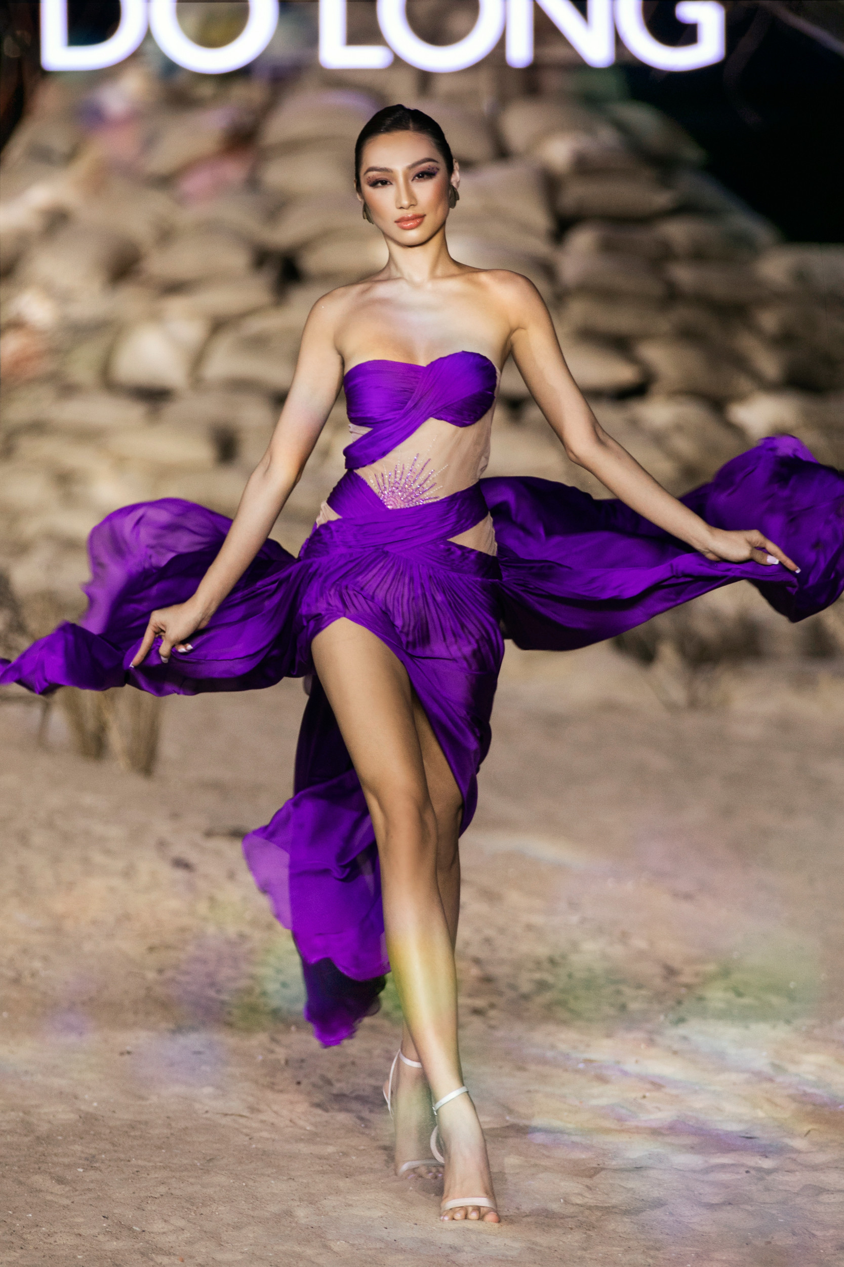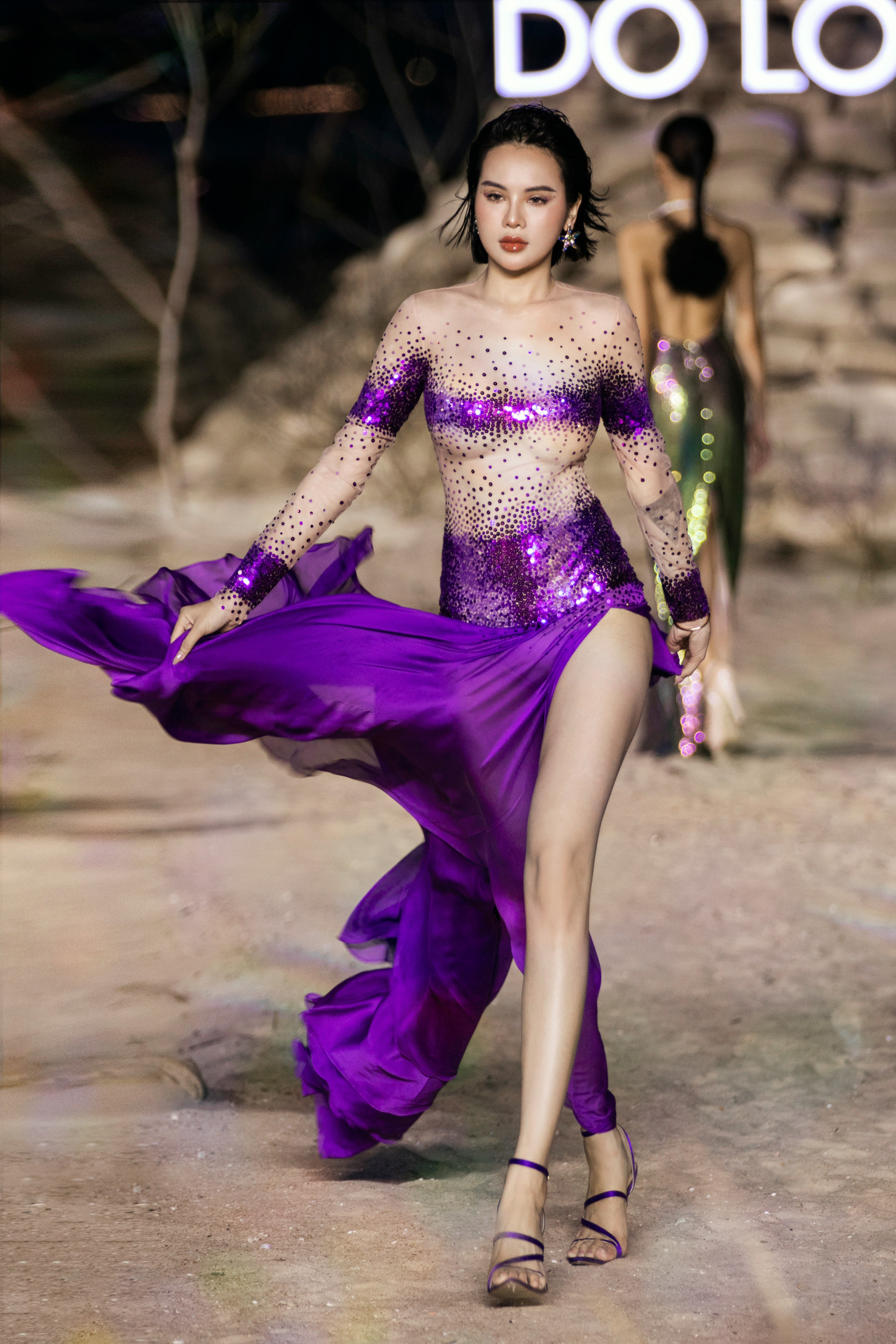 Tại sự kiện Fashion show Rhythm Resort 2023, Lý Nhã Kỳ diện bộ trang phục được NTK Đỗ Long thực hiện riêng với điểm nhấn là chi tiết cắt xẻ ở chân, vai cánh dơi cùng phần xuyên thấu để sao phim Gió nghịch mùa tôn lên lợi thế vòng một bốc lửa.