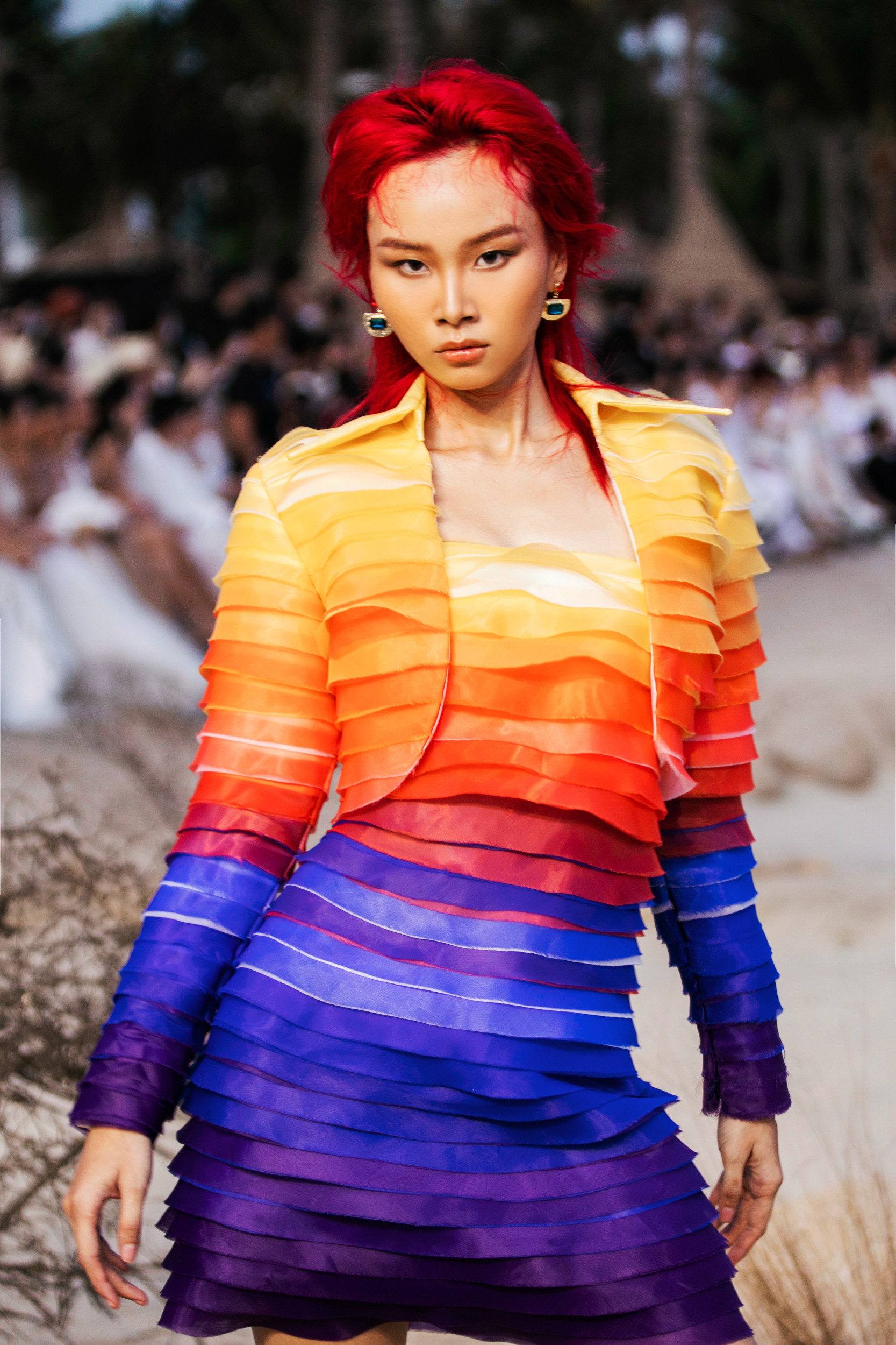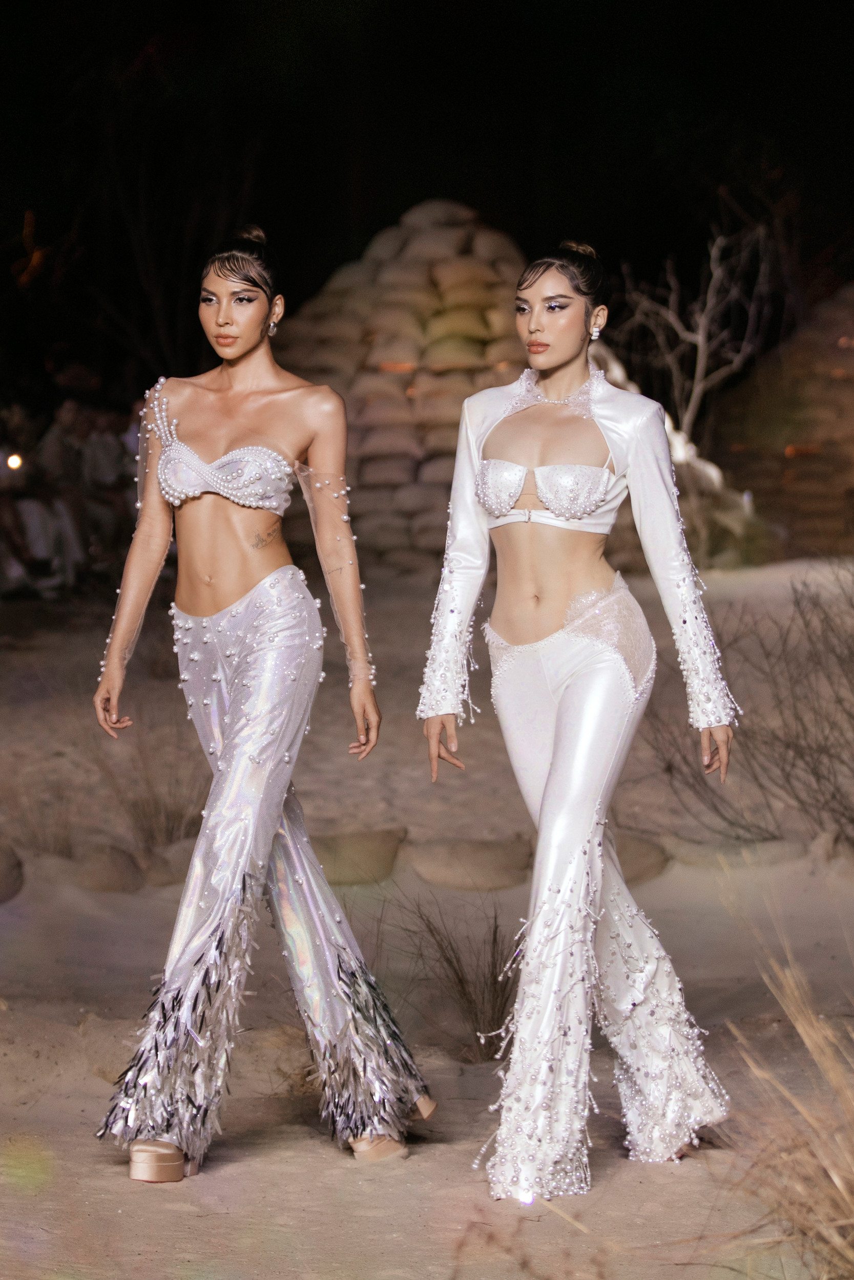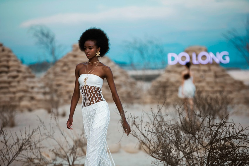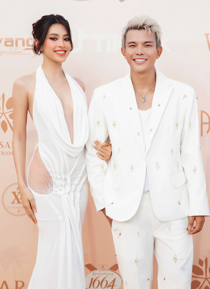 Sang đến màn 2, Võ Hoàng Yến - Minh Tú xuất hiện ấn tượng với màn catwalk chuyên nghiệp. Đôi bạn Minh Triệu – Kỳ Duyên được giao phó nhiệm vụ vedette kết màn cho show. Ngoài những gương mặt tên tuổi hàng đầu làng thời trang xuất hiện trong show diễn, thì hiệu ứng thị giác qua màu sắc cũng là yếu tố nổi bật ở Rhythm resort 2023. BST giúp người xem cảm nhận sự chuyển màu lôi cuốn: Trắng, be khiến người ta liên tưởng đến cát, còn xanh, tím, đỏ hồng tượng trưng cho biển và hoàng hôn. NTK cho biết những dải màu trong BST được lấy cảm hứng từ sự biến đổi của ánh nắng khi đang dần buông xuống cuối ngày, tạo nên cảm giác ấm áp, mộc mạc, yên bình và tự nhiên.Chất liệu cao cấp và kỹ thuật xử lý cũng là điểm nhấn trong BST lần này. Tinh thần “resort” được đề cao cũng là lúc những chất liệu vải thô mộc nhẹ nhàng, thoáng mát được chú trọng như: vải bố, vải đũi, linen và tơ.Ngoài ra, chất liệu thô cũng được NTK áp dụng kỹ thuật thêu ren đục lỗ để tạo nên những bộ cánh mềm mại và đẹp mắt. Các bộ trang phục khoe eo trẻ trung hay váy tiểu thư thanh lịch, những bộ cánh lấp lánh kiêu sa với chân váy đuôi cá hoặc những tà váy dài chính là các sản phẩm mà giới mộ điệu bắt gặp trong BST này.Rhythm Resort 2023 đánh dấu phong cách thiết kế mới của nam nhà mốt. Anh chú trọng vào sự tiện lợi và thoải mái bằng những trang phục có tính ứng dụng cao hơn. Những chất liệu bắt sáng như metallic hoặc kỹ thuật đính kết cầu kỳ vẫn được chú trọng.NTK chia sẻ: “Tôi tự hào khi giới thiệu BST mới. Tôi đã dành khoảng 6 tháng để thực hiện mọi thứ một cách tỉ mỉ, cẩn trọng trong từng chi tiết, đường may.