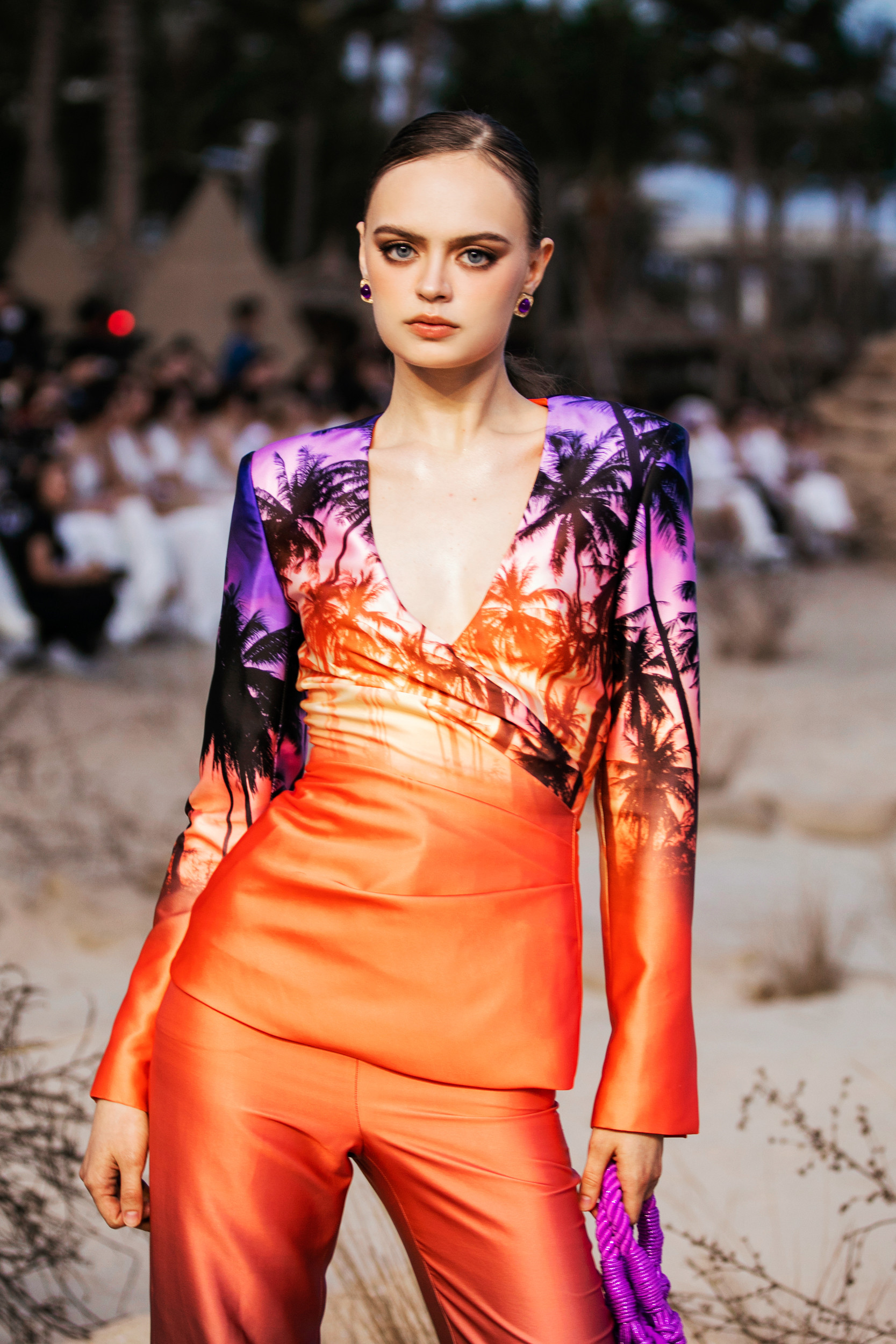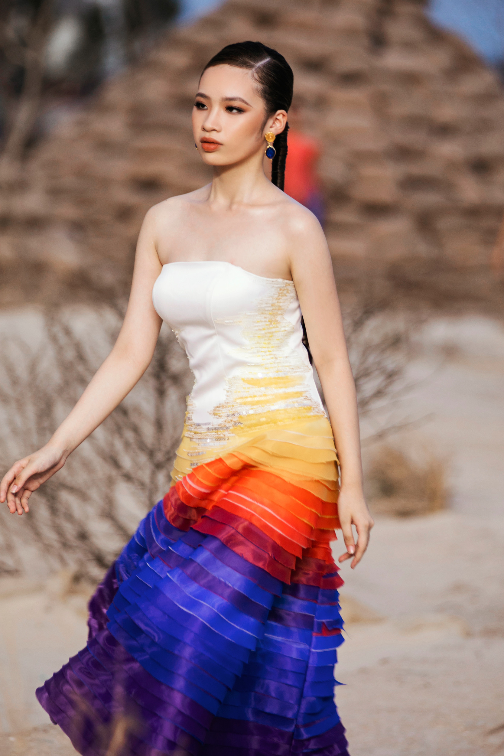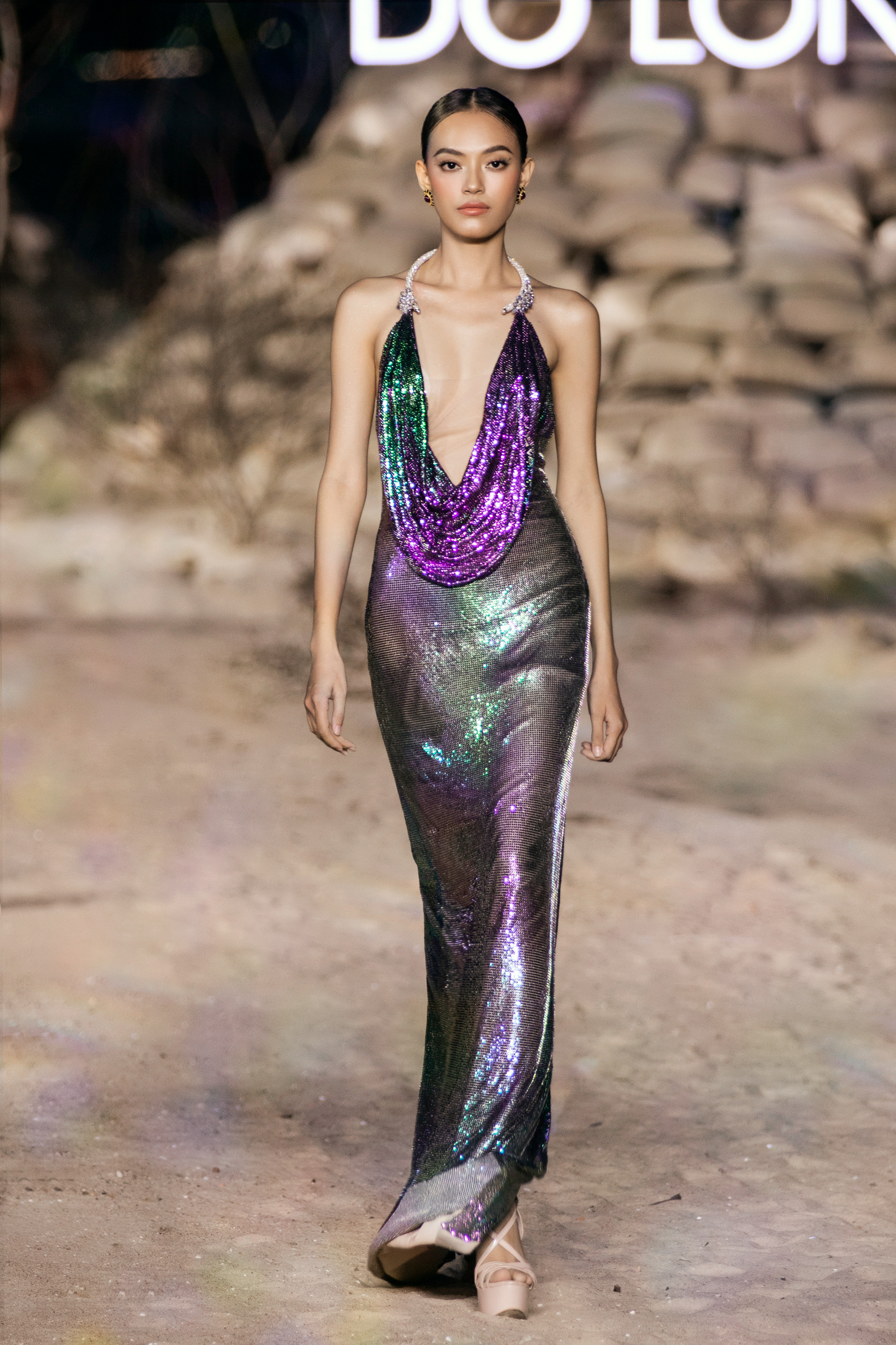 Sang đến màn 2, Võ Hoàng Yến - Minh Tú xuất hiện ấn tượng với màn catwalk chuyên nghiệp. Đôi bạn Minh Triệu – Kỳ Duyên được giao phó nhiệm vụ vedette kết màn cho show. Ngoài những gương mặt tên tuổi hàng đầu làng thời trang xuất hiện trong show diễn, thì hiệu ứng thị giác qua màu sắc cũng là yếu tố nổi bật ở Rhythm resort 2023. BST giúp người xem cảm nhận sự chuyển màu lôi cuốn: Trắng, be khiến người ta liên tưởng đến cát, còn xanh, tím, đỏ hồng tượng trưng cho biển và hoàng hôn. NTK cho biết những dải màu trong BST được lấy cảm hứng từ sự biến đổi của ánh nắng khi đang dần buông xuống cuối ngày, tạo nên cảm giác ấm áp, mộc mạc, yên bình và tự nhiên.Chất liệu cao cấp và kỹ thuật xử lý cũng là điểm nhấn trong BST lần này. Tinh thần “resort” được đề cao cũng là lúc những chất liệu vải thô mộc nhẹ nhàng, thoáng mát được chú trọng như: vải bố, vải đũi, linen và tơ.Ngoài ra, chất liệu thô cũng được NTK áp dụng kỹ thuật thêu ren đục lỗ để tạo nên những bộ cánh mềm mại và đẹp mắt. Các bộ trang phục khoe eo trẻ trung hay váy tiểu thư thanh lịch, những bộ cánh lấp lánh kiêu sa với chân váy đuôi cá hoặc những tà váy dài chính là các sản phẩm mà giới mộ điệu bắt gặp trong BST này.Rhythm Resort 2023 đánh dấu phong cách thiết kế mới của nam nhà mốt. Anh chú trọng vào sự tiện lợi và thoải mái bằng những trang phục có tính ứng dụng cao hơn. Những chất liệu bắt sáng như metallic hoặc kỹ thuật đính kết cầu kỳ vẫn được chú trọng.NTK chia sẻ: “Tôi tự hào khi giới thiệu BST mới. Tôi đã dành khoảng 6 tháng để thực hiện mọi thứ một cách tỉ mỉ, cẩn trọng trong từng chi tiết, đường may.
