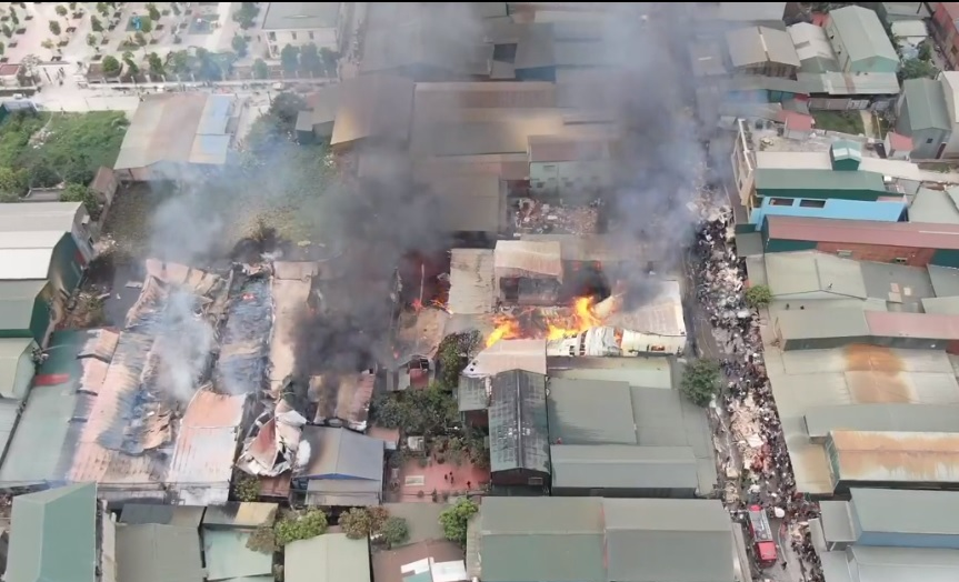 Hình ảnh vụ hỏa hoạn xảy ra ngày 1/12/2020, ngọn lửa lớn bốc lên nhiều giờ đã thiêu rụi hàng chục lán xưởng ở xã Hữu Bằng