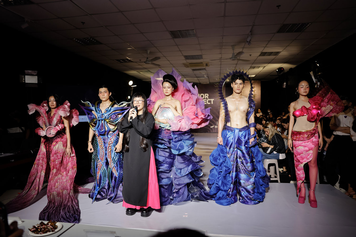 Cô sử dụng đa dạng chất liệu như resin, gel định hình, nhựa lỏng… cùng kỹ thuật đính kết, xếp layer chuyển màu… để hoàn thành ý tưởng kể câu chuyện nàng tiên cá bằng ngôn ngữ thời trang.
