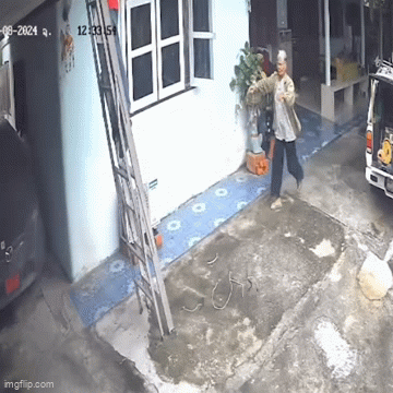 Hình ảnh được camera ghi lại cho thấy, nạn nhân co giật trên chiếc thang gấp, không thể nhấc tay khỏi máng xối, nên đã hét lên cầu cứu khiến bà Sa-ngiam lao nhanh từ trong nhà ra.