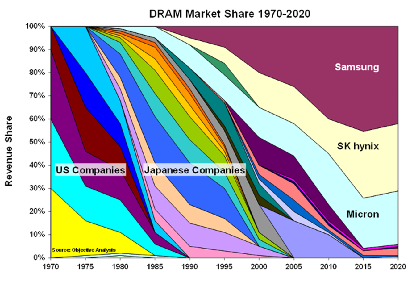 Biểu đồ cho thấy sự thống trị của các công ty Nhật Bản trong lĩnh vực DRAM kết thúc vào cuối những năm 1990.