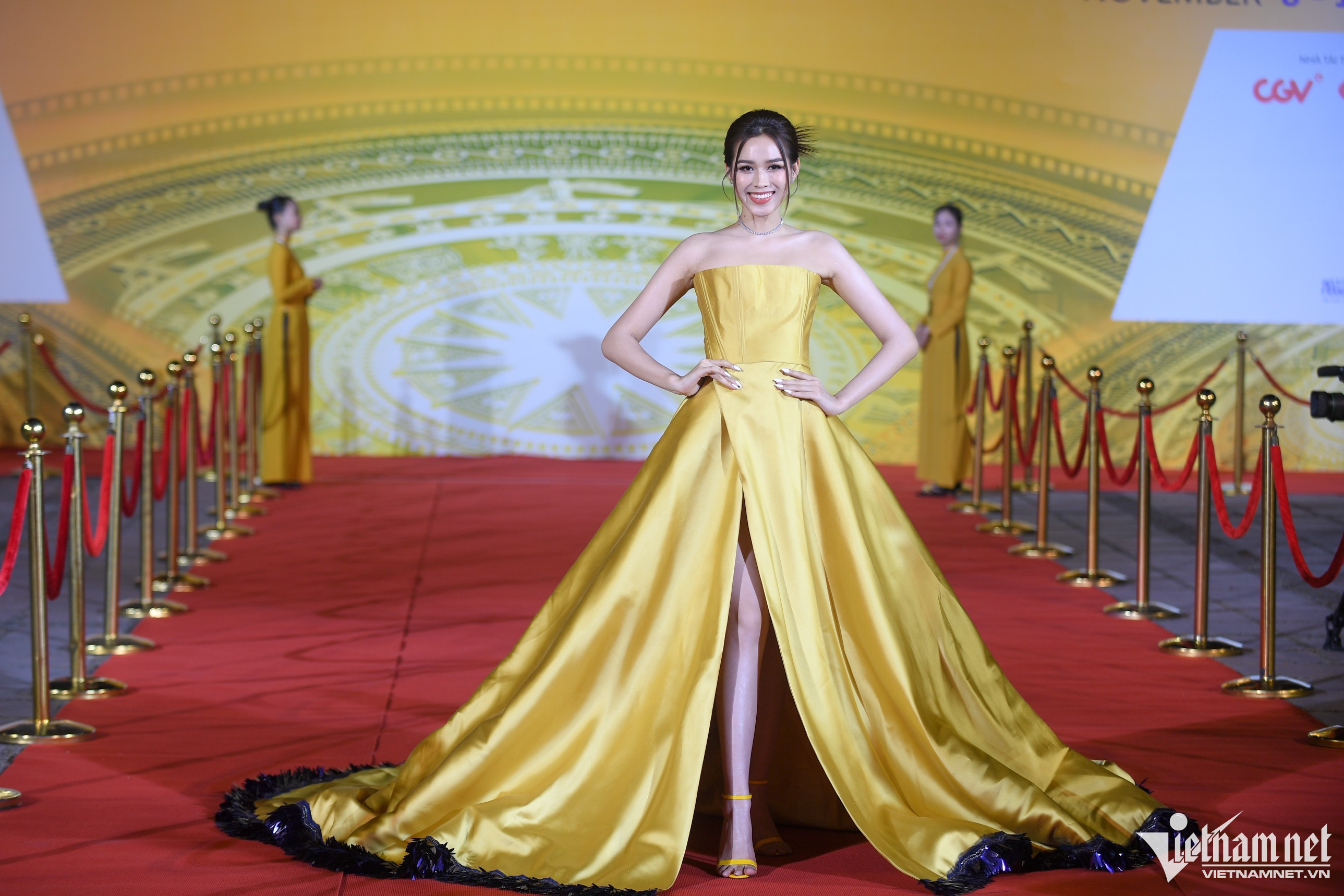 Hoa hậu Việt Nam Đỗ Thị Hà xuất hiện trên thảm đỏ với bộ váy dài với đường xẻ sâu màu vàng vô cùng bắt mắt.