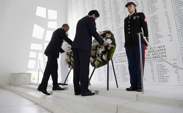 Thủ tướng Nhật Shinzo Abe vừa tới căn cứ hải quân Mỹ ở Trân Châu Cảng, nơi ông gửi lời "chia buồn chân thành và sâu sắc" tới các nạn nhân của vụ Nhật tấn công căn cứ này cách đây 75 năm.