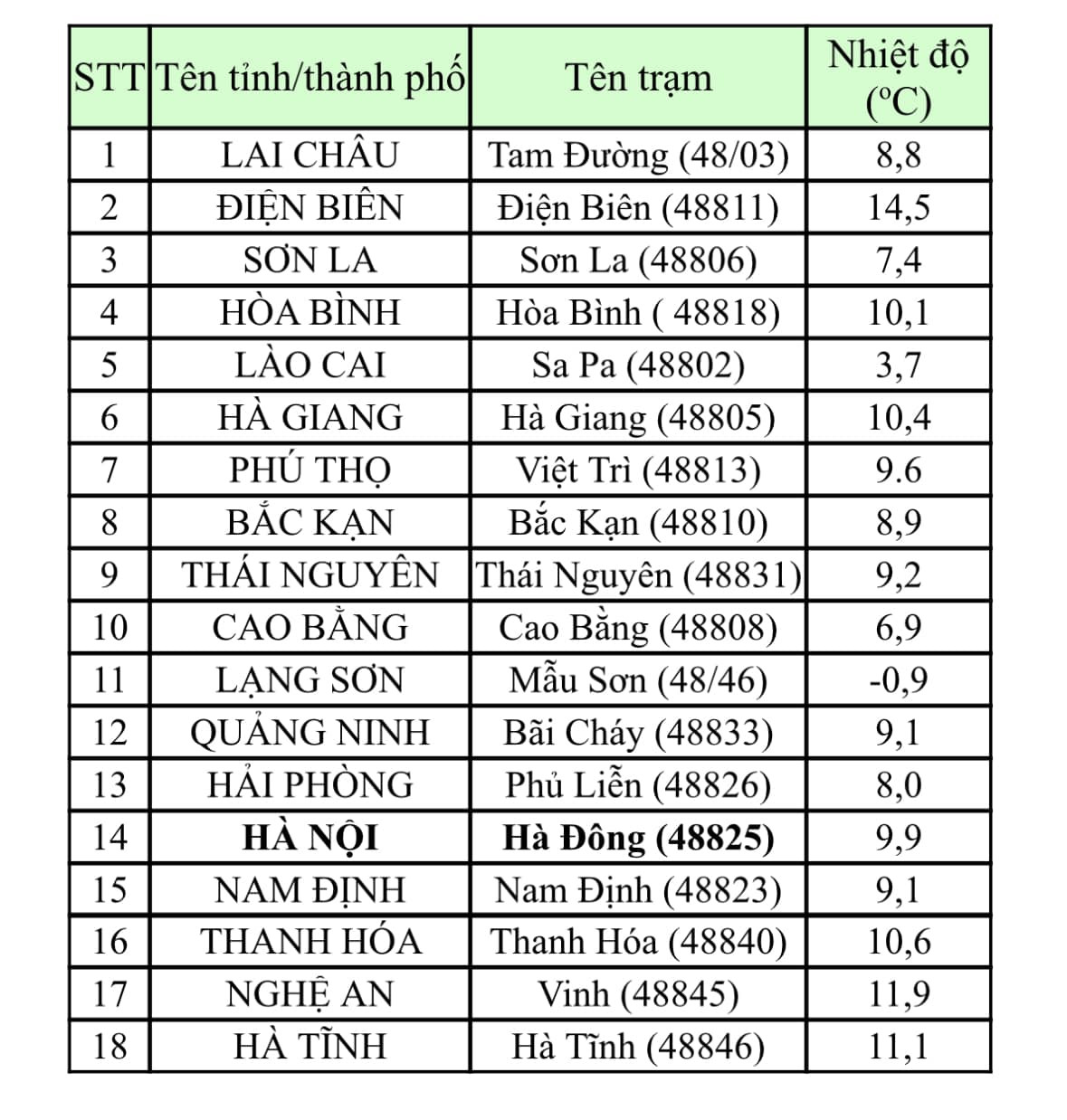 Đáng lưu ý, ở một số khu vực đồng bằng, trung du Bắc Bộ, nhiệt độ nhiều nơi xuống dưới 10 độ như Hải Phòng 8 độ; Quảng Ninh, Hải Dương, Hưng Yên, Nam Định, Hà Nam, Thái Bình đều ở mức 9 đến dưới 10 độ; riêng thủ đô Hà Nội cũng xuống còn 9,9 độ,...