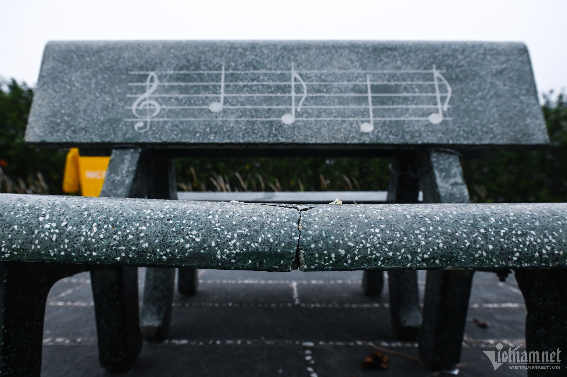 Một vài ghế đá được đặt giữa bãi cỏ, không có lối đi, vị trí ngồi khá kỳ cục. Số khác nứt gãy hoặc được buộc lại với nhau bằng dây thép.