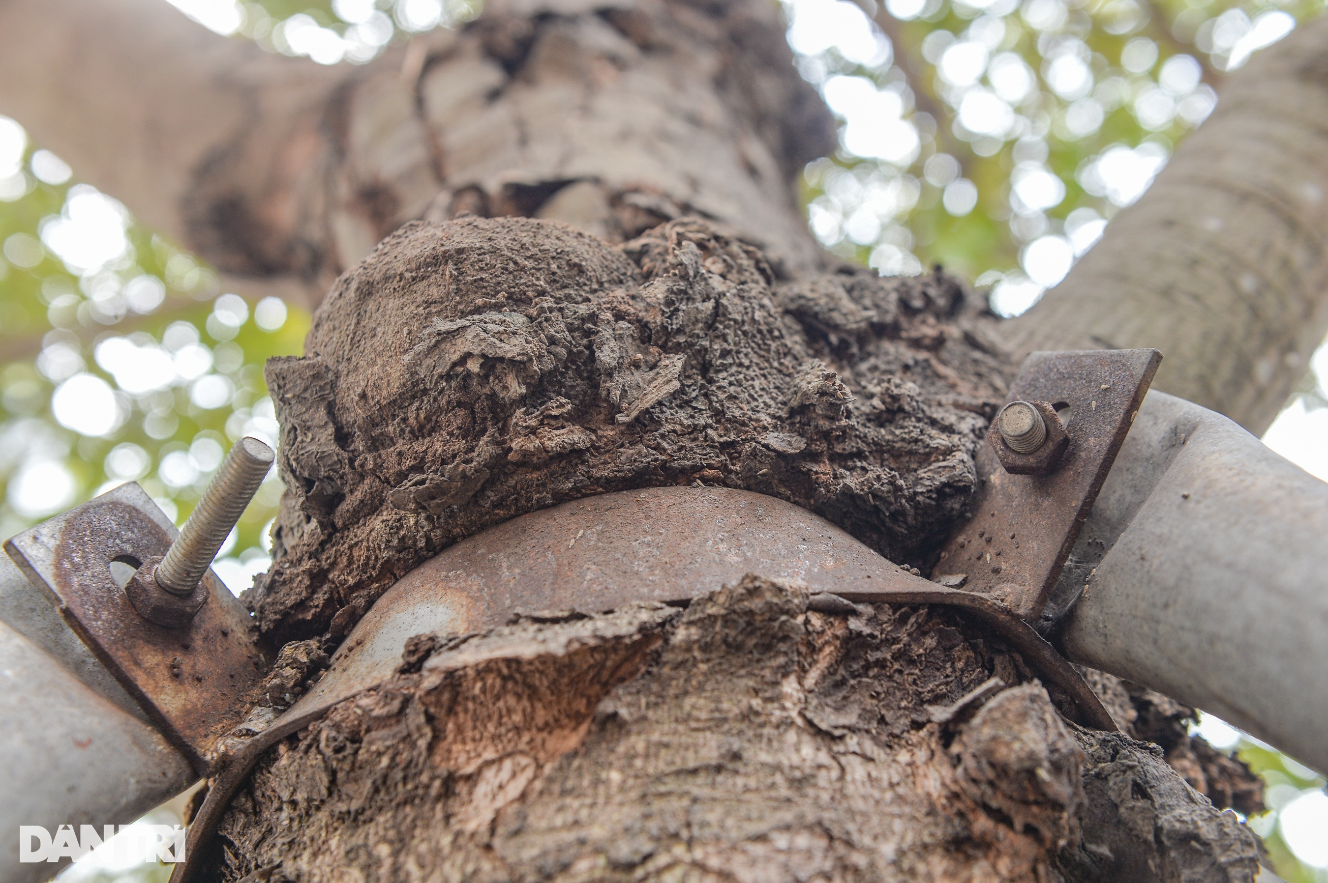 Cây xanh ở khu đô thị Văn Phú bị gông sắt siết chặt, ăn sâu vào thân cây tạo thành những vết sẹo lớn (Ảnh: Nguyễn Hải)