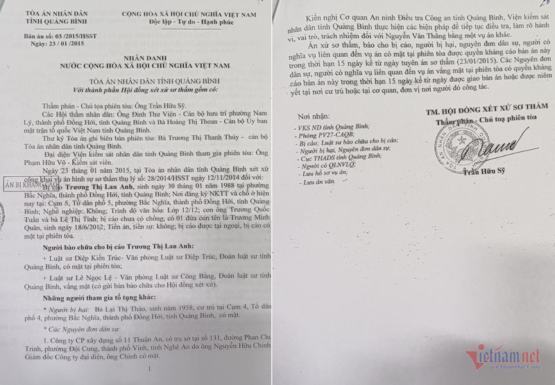 Trước đó, theo bản án số 21/2015/HS-PT ngày 23/11/2015 của TAND Tối cao tại Đà Nẵng, đầu năm 2010, Trương Thị Lan Anh nhờ mẹ đẻ là bà Lê Thị Tính bảo lãnh để vay của bà Lại Thị Thảo (SN 1958, trú cùng phường) số tiền 10 triệu đồng.