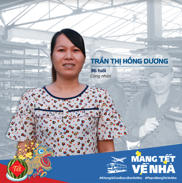 Có hoàn cảnh tương đồng với Nghi, chị Hồng Dương là công nhân tại một công ty bánh kẹo. Chị chia sẻ, hoàn cảnh khó khăn tới mức vợ chồng chị đành phải gửi 2 đứa con về quê nhờ ông bà chăm sóc. Ở thành phố, hai anh chị luôn cố gắng chăm chỉ, làm nhiều việc khác nhau để tích cóp, gửi về quê mong cuối năm cả nhà đoàn tụ. Chị Hồng Dương chia sẻ: “Cả năm vất vả cũng chỉ mong mấy ngày Tết được ăn bữa cơm nóng cùng ba mẹ và 2 đứa nhỏ.”.