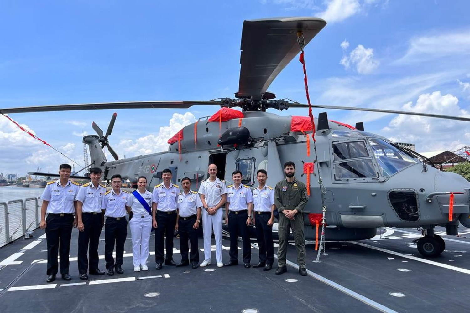 Các cán bộ Hải quân Việt Nam chụp hình cùng thủy thủ tàu Francesco Morosini. Ảnh: Đại sứ quán Italia tại Việt Nam