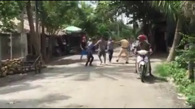 Các đối tượng vây đánh CSGT. Ảnh cắt từ clip |