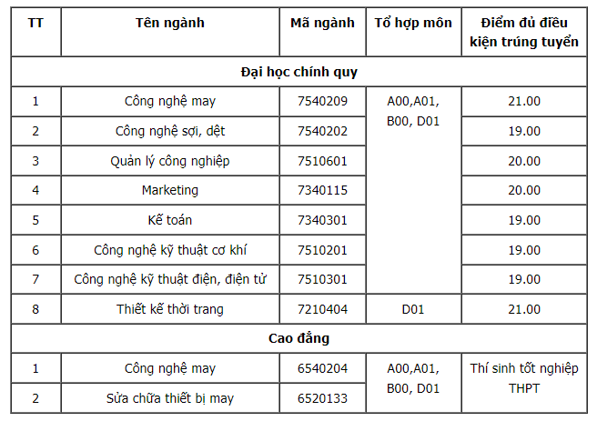 Trường Đại học Công nghiệp Dệt May Hà Nội cũng lấy điểm chuẩn học bạ ở mức 19-21 điểm. Hai ngành Thiết kế thời trang, Công nghệ may lấy 21 điểm. Ngành “hot” như Marketing tại trường cũng chỉ ở mức 20 điểm, cùng điểm chuẩn với ngành Quản lý công nghiệp. Các ngành còn lại có điểm chuẩn xét học bạ là 19 điểm.