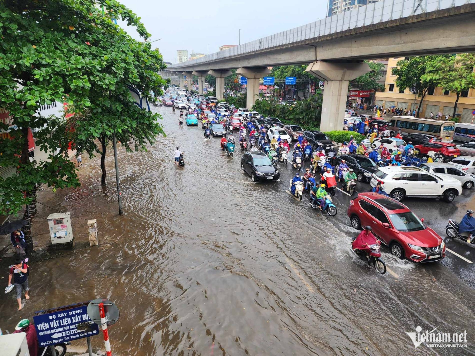 Theo ghi nhận của phóng viên, từ sáng sớm, tuyến phố Nguyễn Tuân tê liệt, giao thông ùn tắc nghiêm trọng. Nước ngập sâu tới 50cm khiến nhiều phương tiện giao thông bị chết máy, người dân phải bì bõm lội nước.