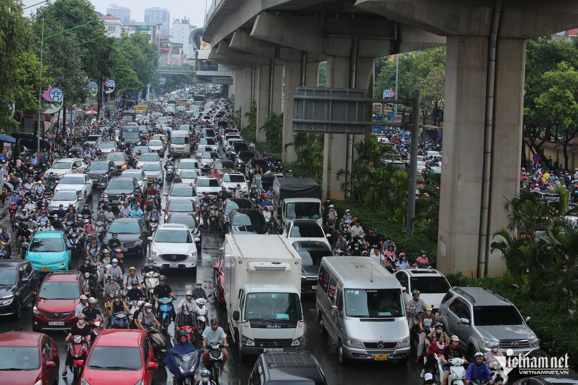 Nước bắt đầu rút trên đường Nguyễn Xiển. Tuy nhiên, dòng ô tô và xe máy theo chiều từ Thanh Xuân đi Thanh Trì vẫn không thể di chuyển.