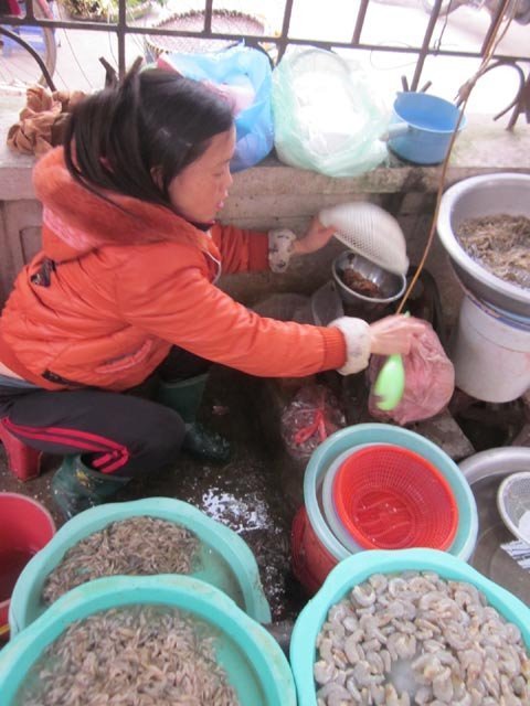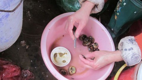 Không chỉ thịt lợn, các mặt hàng thủy, hải sản như tôm, cua, ốc, cá… cũng sẵn sàng được sơ chế khi khách hàng yêu cầu. Đáng chú ý là cách sơ chế cua. Những con cua được đặt ở trong chậu, cả những con còn sống và những con đã chết. Khi mua hàng khách sẽ chọn cua, cho vào một cái xô. Tiếp đó, người bán hàng sẽ đổ nước vào xô đựng cua, xóc qua rồi gạn bỏ nước. Số cua trong xô được nhanh chóng bỏ mai, lấy gạch và cho vào máy xay xay nhuyễn. Điều đáng nói ở đây là, số cua bẩn chỉ được xóc qua một lần nước rồi nảy gạch và cho vào máy xay. Nước rửa cua thường đục ngầu bùn đất.