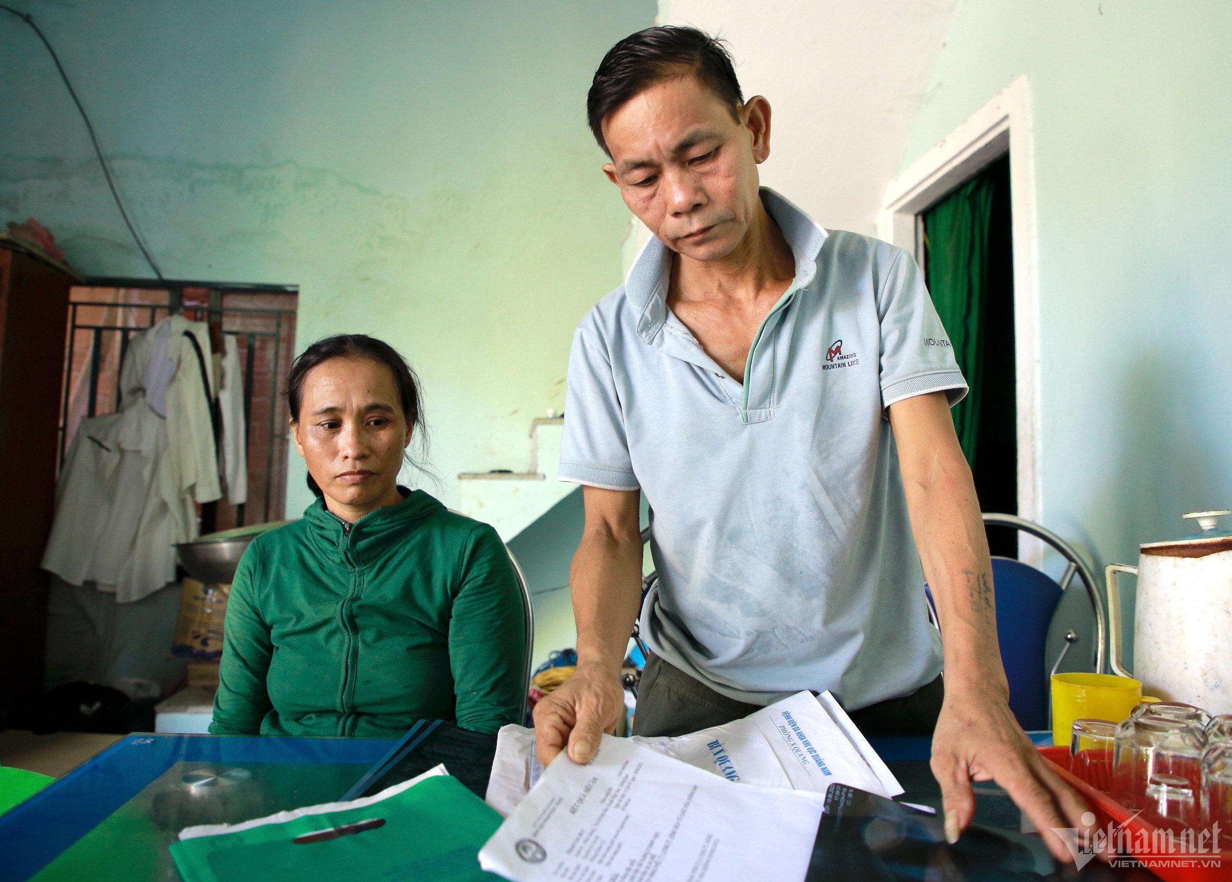 “Bác sĩ bảo tôi bị lao phổi, từ giờ không được làm việc nặng. Mà nay mẹ già đã gần 90 tuổi, con nằm trong cũi, đứa lớn cũng bệnh tật, tôi chẳng thể giúp được gì, cảm thấy bất lực vô cùng", ông nghẹn giọng.