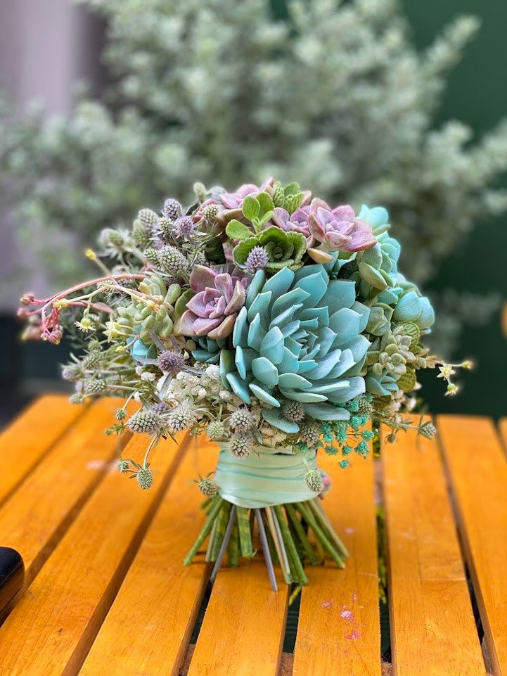 Một trong những sự sáng tạo của chị Mỹ với sen đá là biến chúng thành những bó hoa cầm tay của cô dâu. Mỗi bó hoa như thế này thường có giá khoảng 1,3 triệu đồng.