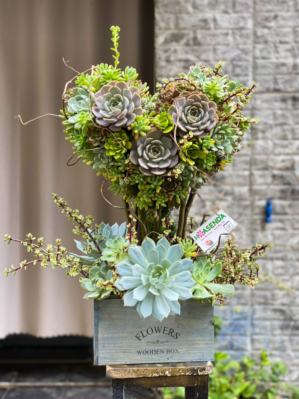 "Sen đá rất nặng và cũng khó tạo hình hơn hoa tươi nhiều. Thời gian ban đầu, tôi gặp khó khăn khi thiết kế mẫu, nhiều khi phải cắm đi cắm lại một chậu sen đá cả chục lần mới ra được sản phẩm ưng ý", chị Mỹ nói.