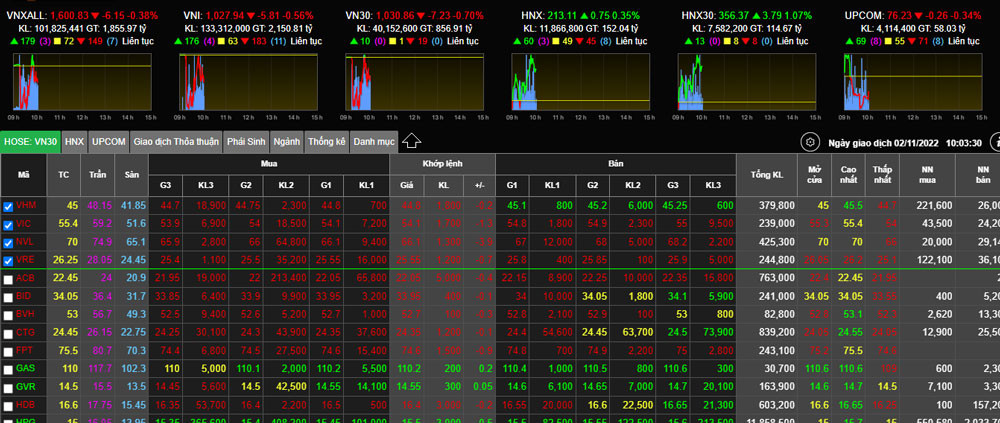 Thanh khoản ở mức thấp do dòng tiền eo hẹp. Tính tới 10h43 ngày 2/11, chỉ số VN-Index giảm 3,2 điểm xuống ngưỡng 1.030 điểm. Trong phiên sáng có lúc VN-Index giảm gần 10 điểm.