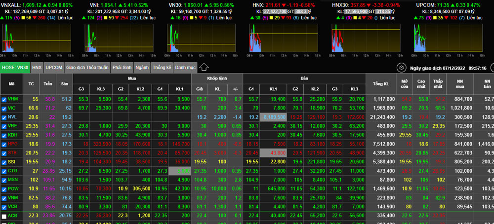 Kết thúc phiên giao dịch 7/12, chỉ số VN-Index giảm 7,67 điểm xuống 1.041,02 điểm. HNX-Index giảm 1,35% xuống 209,93 điểm. Upcom-Index cũng mất hơn 1,2%.