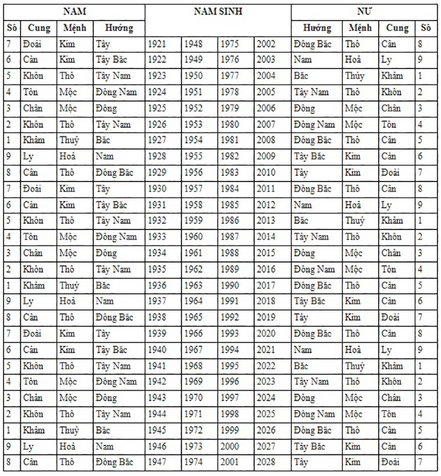 Sau khi cộng ra được một số thì dựa vào bảng sau để biết gia chủ thuộc cung gì.