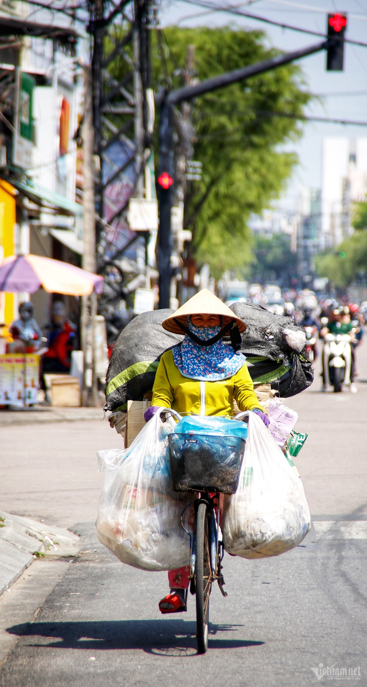 Bà Nguyễn Thị Kiên (57 tuổi, phường Hòa Hương, TP Tam Kỳ) hành nghề ve chai hơn 30 năm. Hôm nay bà đi làm từ sáng sớm để tránh nắng nóng.