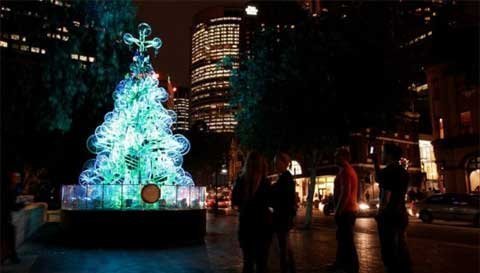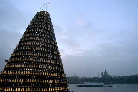 Cây thông này được làm từ 2.500 chai bia rỗng, là tác phẩm của các nghệ sĩ Đức Ralph Juecker và Thomas Kraus ở Cologne.