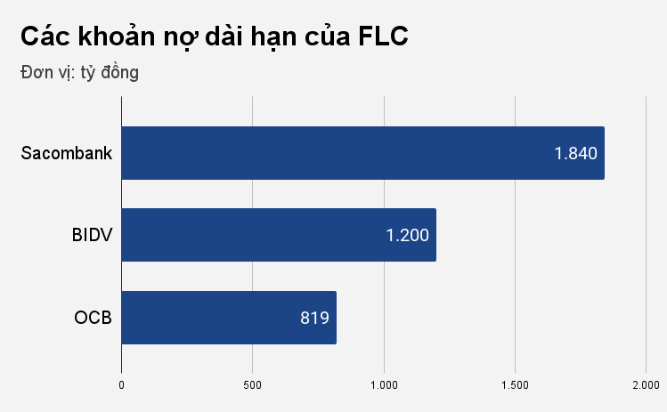 Còn trong số các khoản vay dài hạn, FLC đang nợ Sacombank nhiều nhất với số tiền 1.840 tỷ đồng. Song song đó, BIDV cũng cho FLC vay dài hạn 1.200 tỷ đồng. Ngoài ra, doanh nghiệp này còn phát hành trái phiếu với kỳ hạn dài cho OCB với dư nợ 819 tỷ đồng.