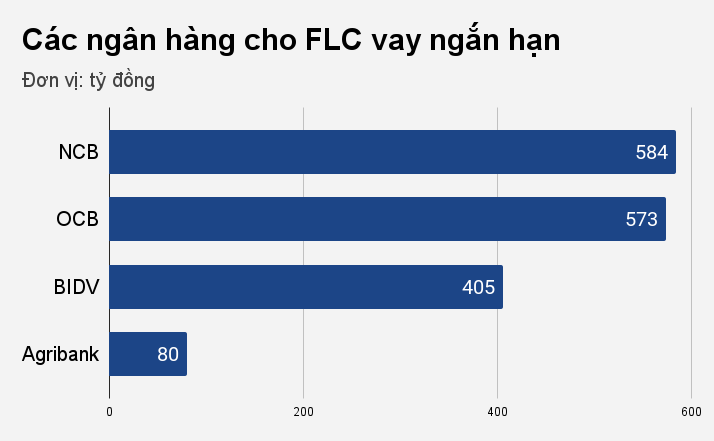 Trong số các ngân hàng đang cho vay ngắn hạn với FLC, một số nhà băng cấp tín dụng lớn cho doanh nghiệp do ông Trịnh Văn Quyết làm Chủ tịch HĐQT bao gồm NCB với dư nợ 584 tỷ đồng, OCB 573 tỷ đồng, BIDV 405 tỷ đồng. Ngoài ra, FLC còn một khoản nợ trái phiếu ngắn hạn 150 tỷ đồng với Công ty Chứng khoán MBS và vay 80 tỷ đồng từ Agribank.