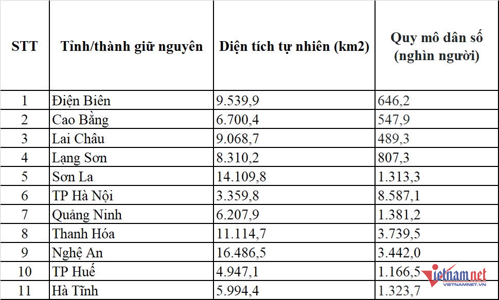 Số liệu này cho thấy các tỉnh giữ nguyên có diện tích trung bình lớn hơn các tỉnh, thành sau sáp nhập. Điều đó cho thấy các địa phương này đã đạt ngưỡng về quy mô diện tích. Tuy nhiên, mật độ dân số các tỉnh này thấp hơn các tỉnh, thành sau sáp nhập, đặc biệt rõ rệt ở các tỉnh miền núi như Lai Châu, Cao Bằng, Điện Biên (dưới 100 người/km2).