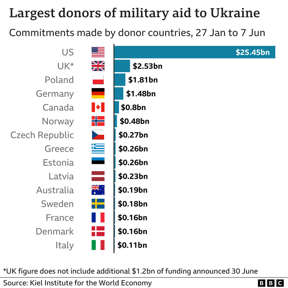 Các nước cam kết viện trợ quân sự nhiều nhất cho Ukraine, tính từ ngày 27/1 - 7/6, trong đó số liệu không bao gồm khoản bổ sung 1,2 tỷ USD của chính phủ Anh công bố dành cho Kiev ngày 30/6. Nguồn: Viện Kiel về kinh tế thế giới