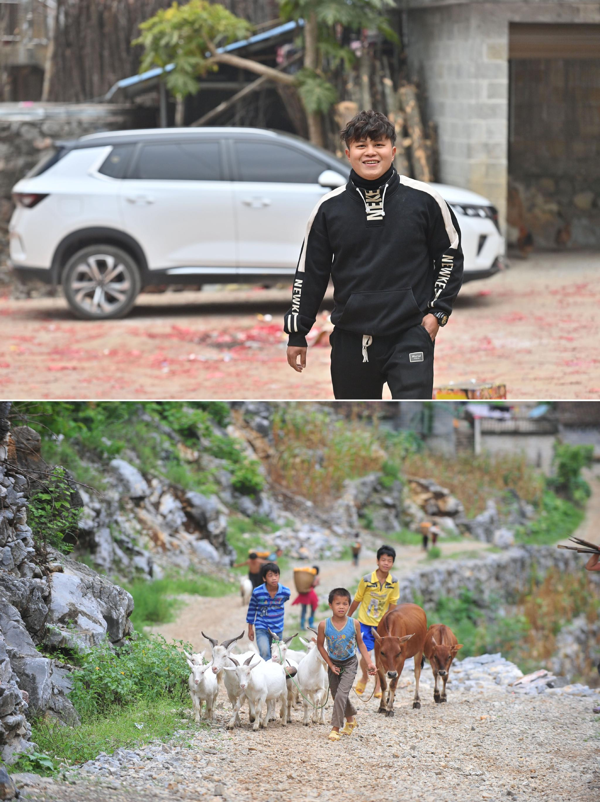 Ảnh phải: Meng Xuanhong (trái) và Lan Xiaoshuai trên đường làng Nonglong năm 2023.