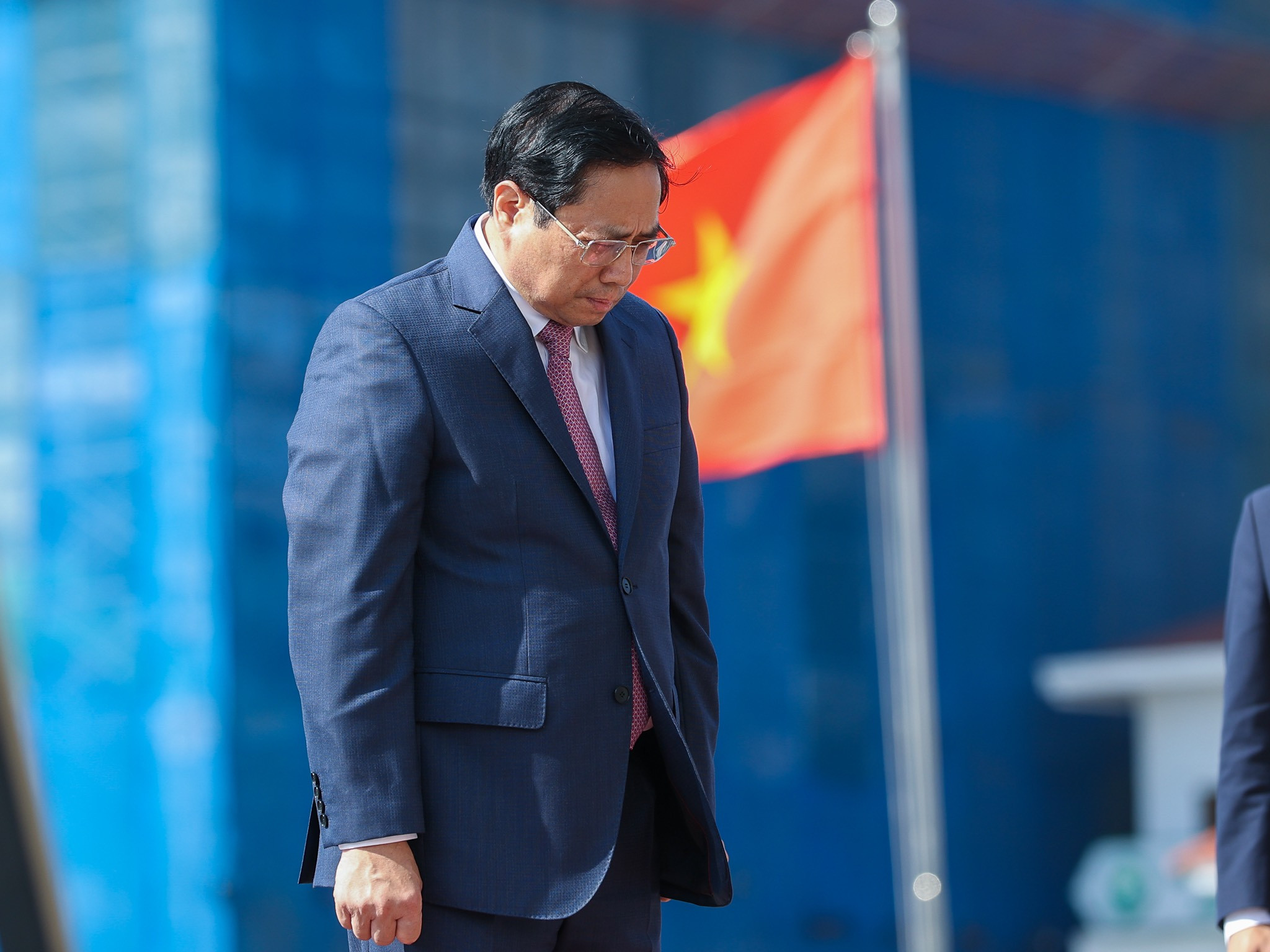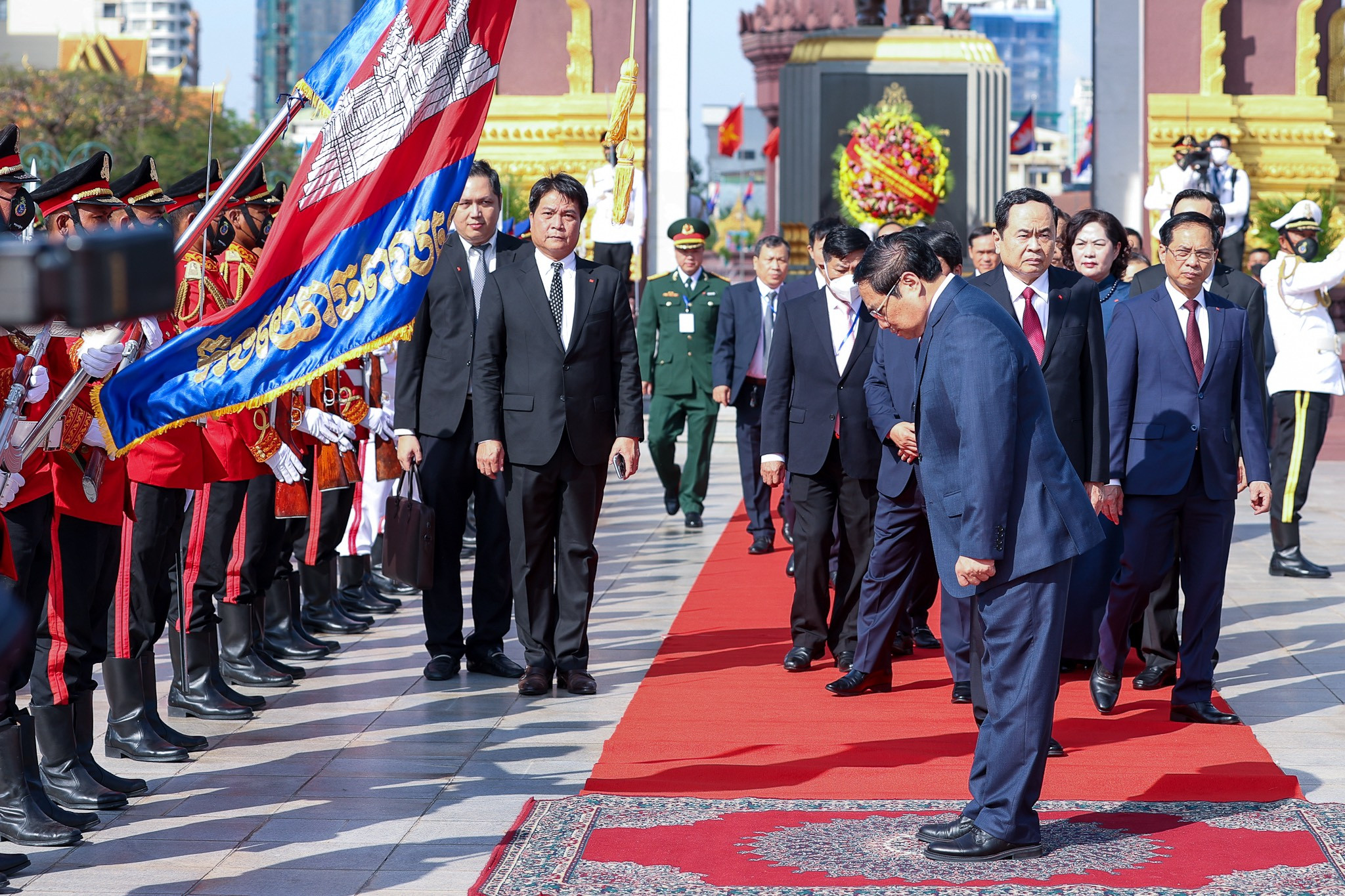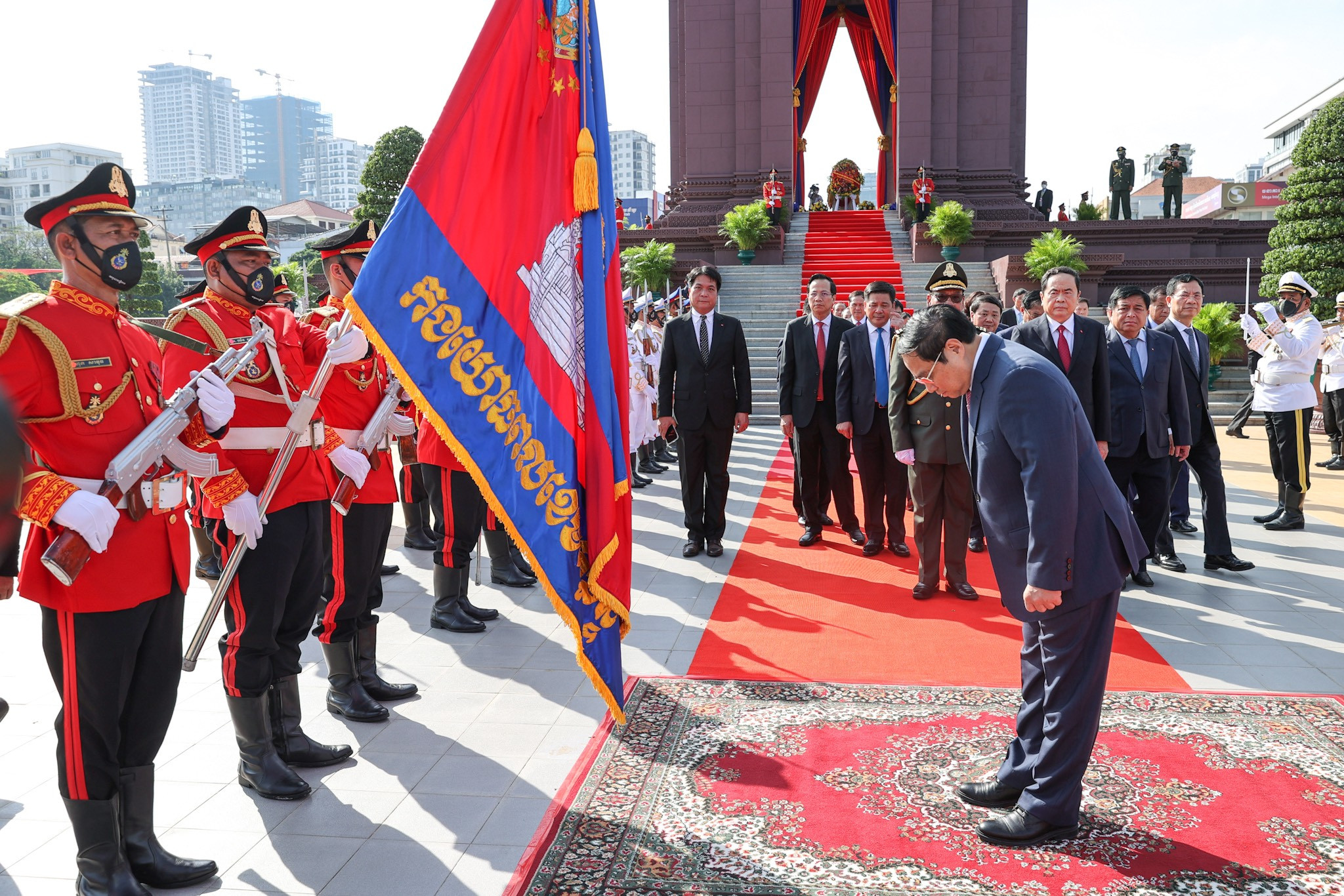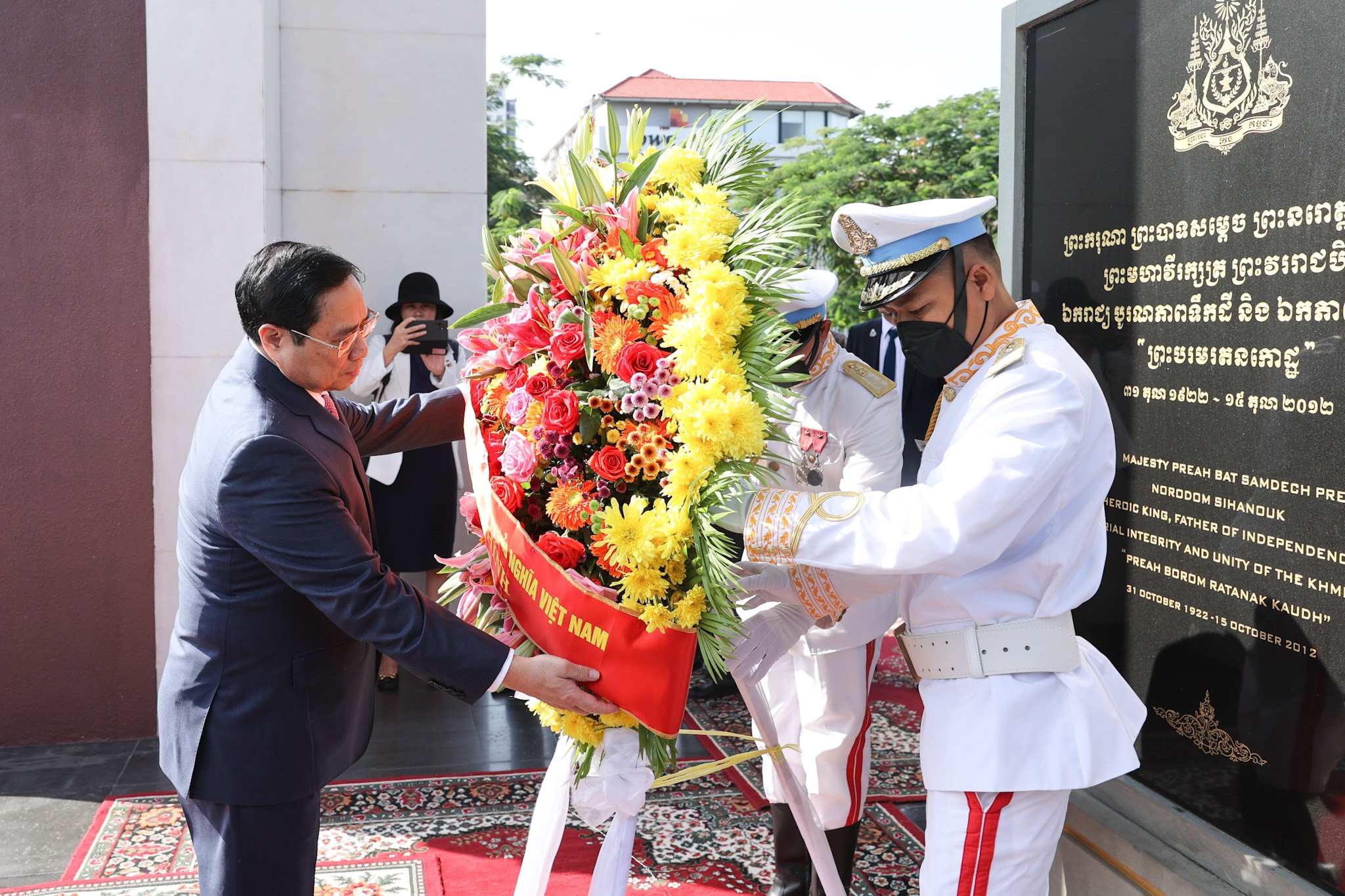 Ngay sau khi xuống máy bay, Thủ tướng Phạm Minh Chính và Đoàn Đại biểu Cấp cao Việt Nam đến đặt vòng hoa tại Đài Độc lập, Tượng đài cố Quốc vương Norodom Sihanouk và Đài Hữu nghị Việt Nam – Campuchia.