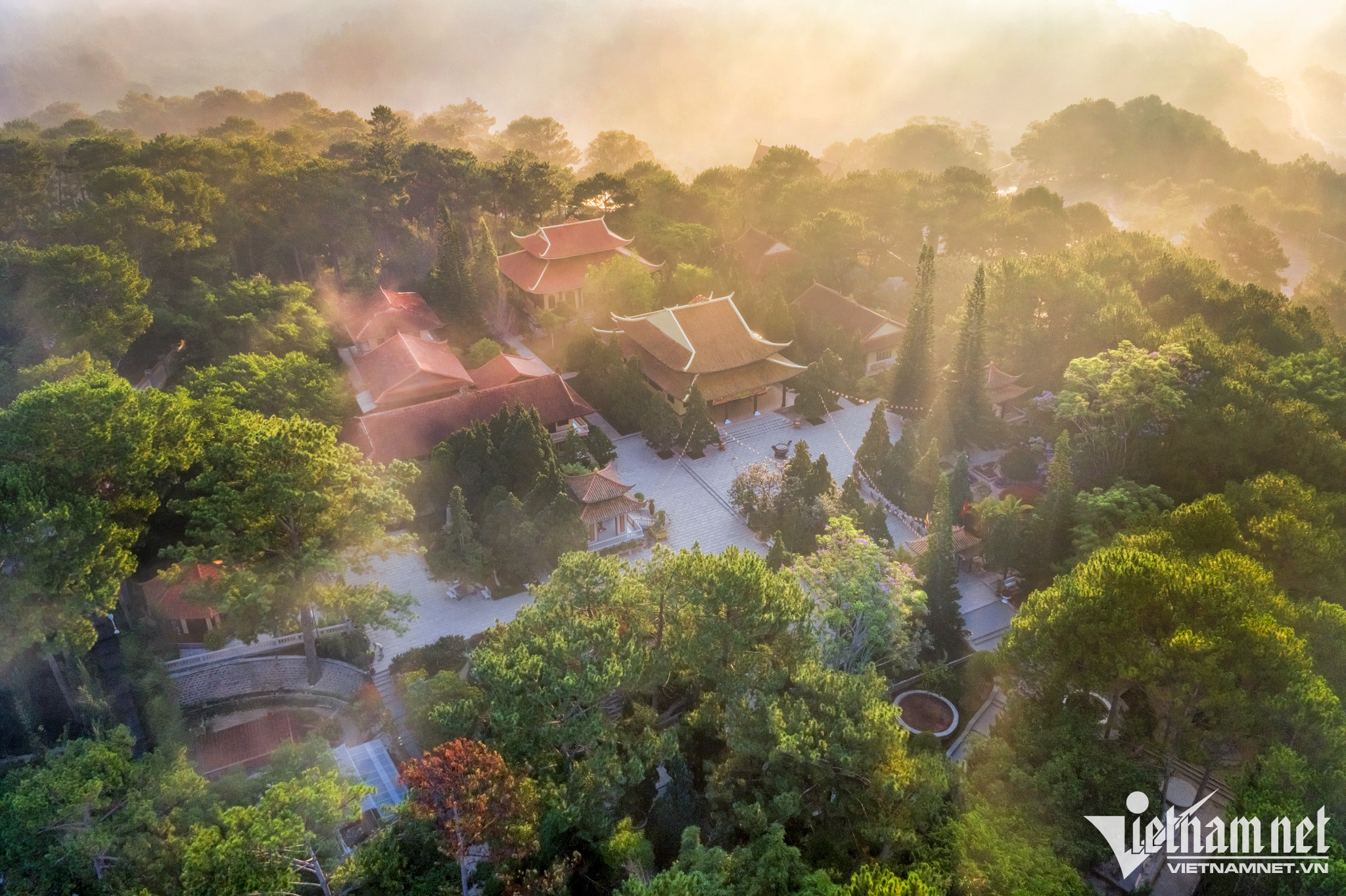 Thiền viện Trúc Lâm là một trong 3 thiền viện lớn nhất ở Việt Nam thuộc dòng Trúc Lâm Yên Tử với diện tích lên tới 30ha. Từ thiền viện đi tới trung tâm thành phố Đà Lạt khoảng 5km. Hai bên đường vào thiền viện được bao bọc bởi những cánh rừng thông bạt ngàn. Ảnh: Lều Trung Hiếu.