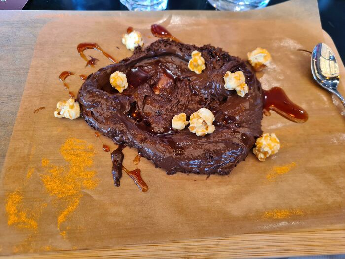 Đây là món bánh mousse chocolate với bỏng ngô được bày trên thớt gỗ. |
