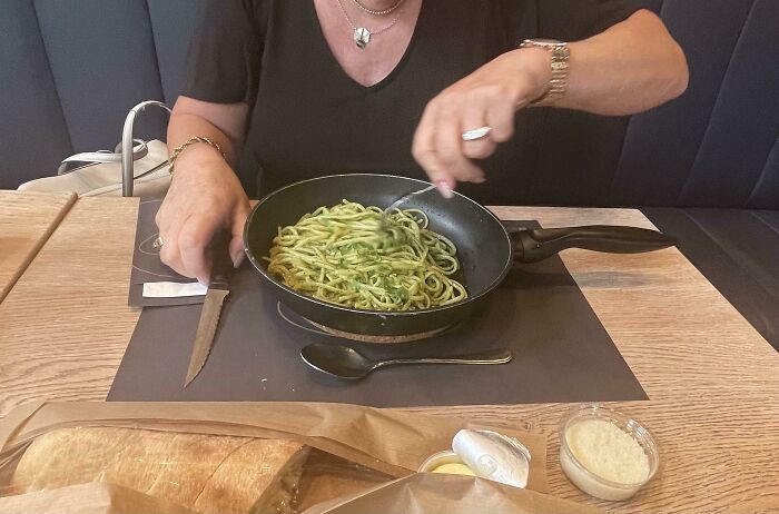 Nhà hàng này thì dùng hẳn chảo thay đĩa để phục vụ món mì. |