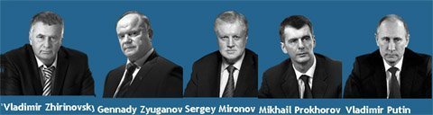 Năm ứng cử viên Tổng thống Nga lần này gồm có đương kim Thủ tướng Nga Vladimir Putin, lãnh đạo Đảng Cộng sản Nga Gennady Zyuganov, lãnh đạo đảng Dân chủ Tự do Vladimir Zhirinovsky, lãnh đạo đảng Nước Nga Công bằng Sergei Mironov và tỉ phú Mikhail Prokhorov.