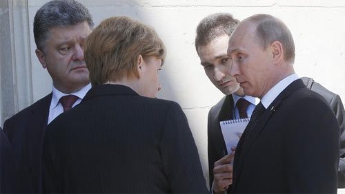 Tổng thống Ukraina Petro Poroshenko (trái) và Thủ tướng Đức Angela Merkel (giữa) gặp Tổng thống Nga Vladimir Putin bên lề lễ kỷ niệm D-Day ở Normandy, Pháp, ngày 6/6. (Ảnh: AP) |